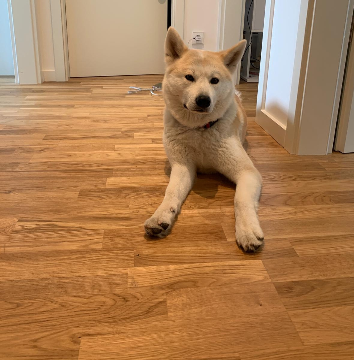 지볼일 이미 끝나고도 우리와 빵가게 찾아다니느라 한참 다녀야 했던 나리는 다시 나가자 할까 봐 몸을 바짝 낮추고 자빠졌다.