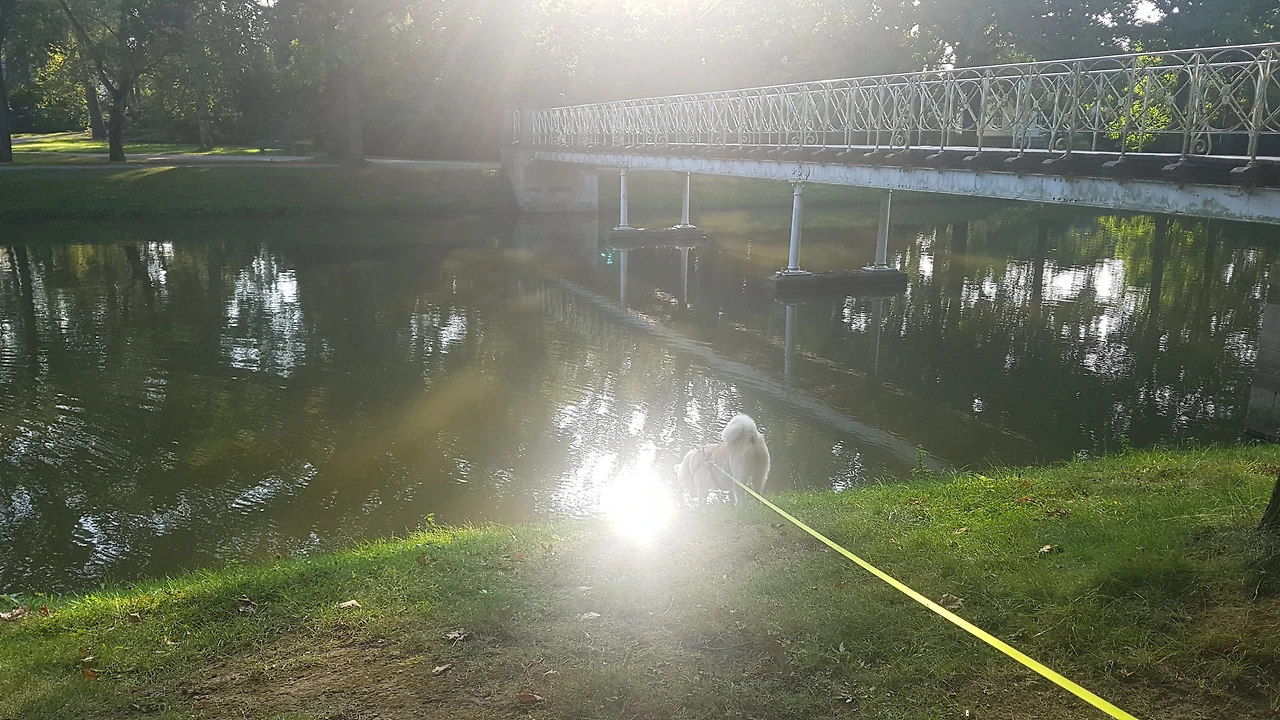 물 위에 오리들에게 가고 싶어 촐랑 대는 나리를 데리고 강 건너편 쪽으로 가려고 다리를 건넜다.