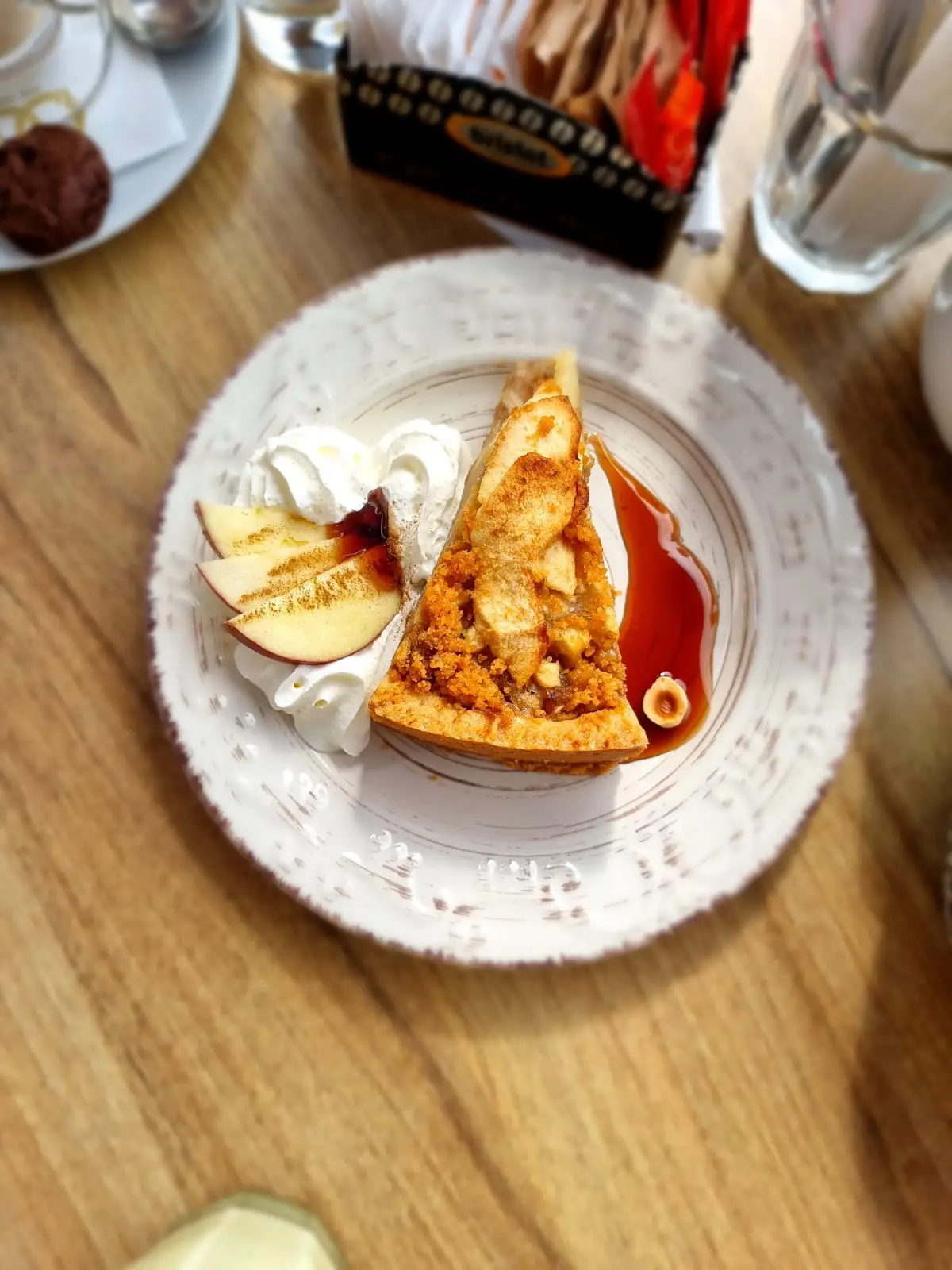 우리는 사과 케이크와 치즈 케이크를 주문해서 떨어진 당을 충족시키기로 했다.