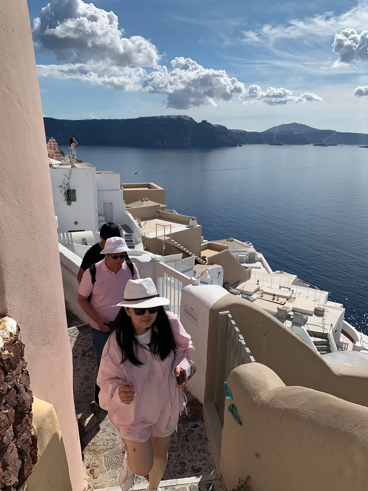 화산 폭발로 망가진 산토리니는 아주 가난한 섬이었다고 했다. 이 섬을 아름답게 복구하겠다는 뜻을 가지고 모여든 예술가 들의 열정으로 인해 세계적인 관광명소로 거듭났노라 이야기하며 요즘은 코로나 때문에 관광지에서 사람들을 여럿 모아 데리고 다니며 관광 가이드가 투어 하는 것이 그리스에서 법으로 금지되어 있다고 했다.