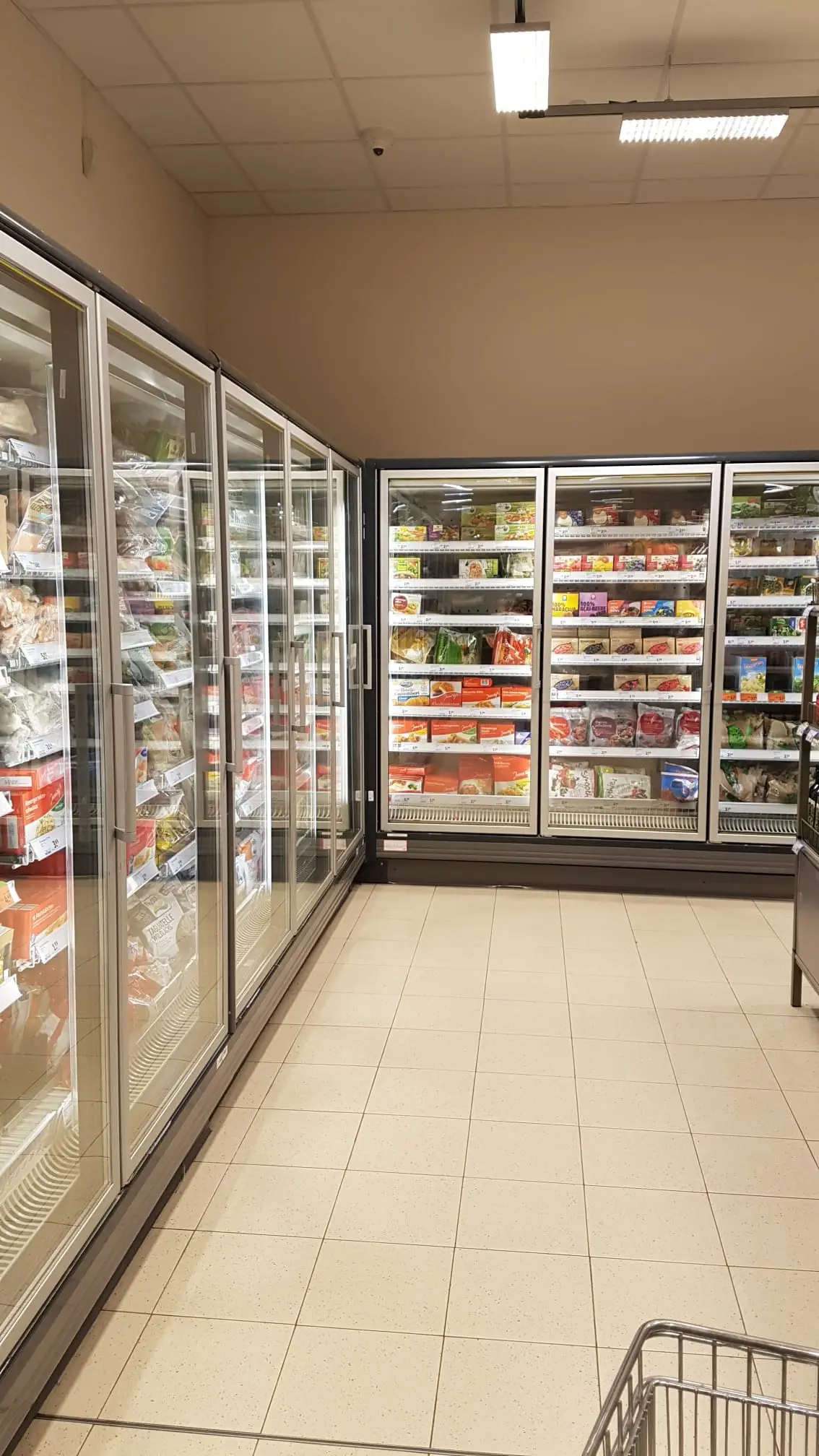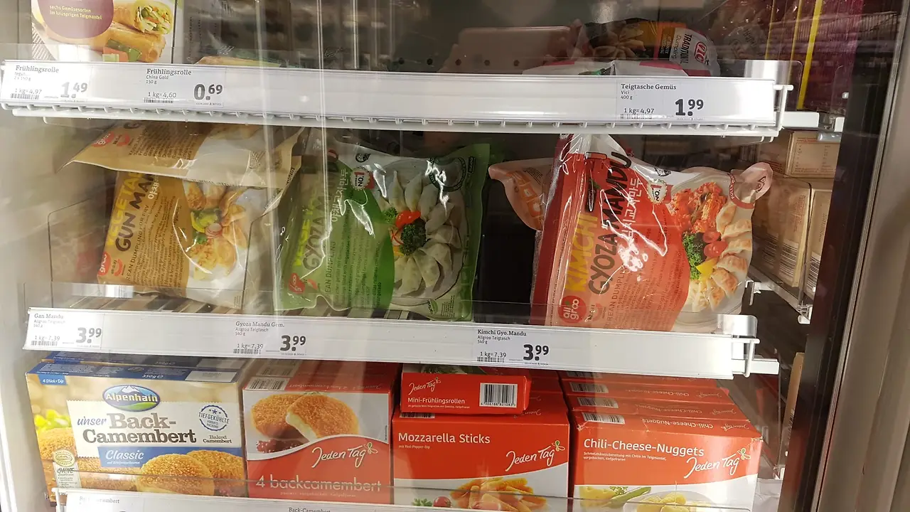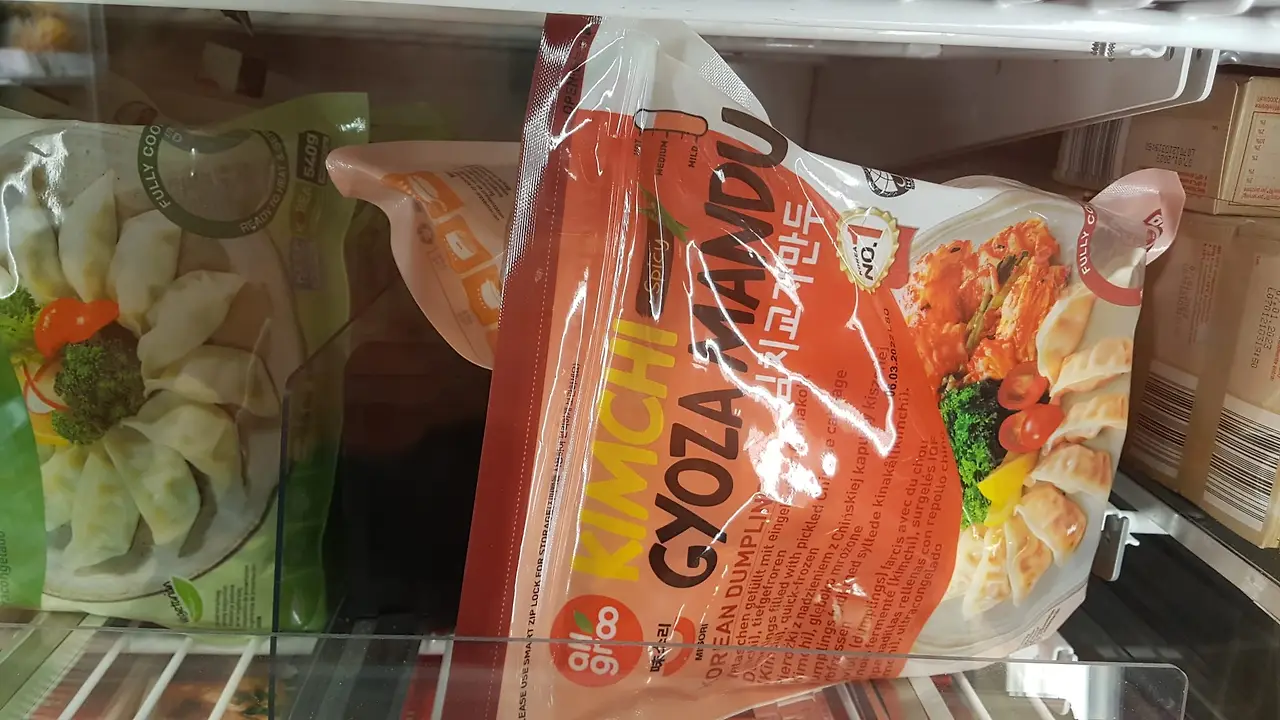 필요한 채소 토마토, 오이, 양상추, 빨강 피망을 카트에 담고 앞쪽 냉장칸에서 우유와 치즈를 담고 냉동고에 있는 한국 야채 군만두도 하나 담았다.