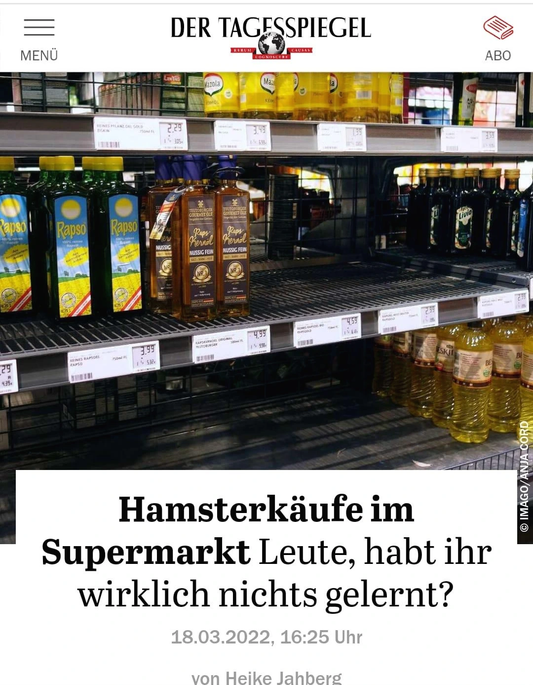 요즘 Der Tagesspiegel 등…독일 신문 에서는 마트에서 다시 사재기가 시작되었다며 “아직도 배우지 못했는가?”등의 강한 어조로 사재기를 경고하고 독일은 사재기를 할 필요가 없으니 자재하라는 기사들을 쉽게 찾아볼 수 있다. 혹자는 우크라이나에서 밀가루의 많은 부분을 수입했었는데 전쟁으로 유통과정이 원활하지 않은 문제가 발생할 것이라는 것 때문에 자동차 원유 가격처럼 폭등할 것이라는 이유로 사재기가 시작되었을 것이라 분석하는 사람도 있고 또는 전쟁의 불안감으로 일단 사재기하는 것이라는 분석도 나온다.