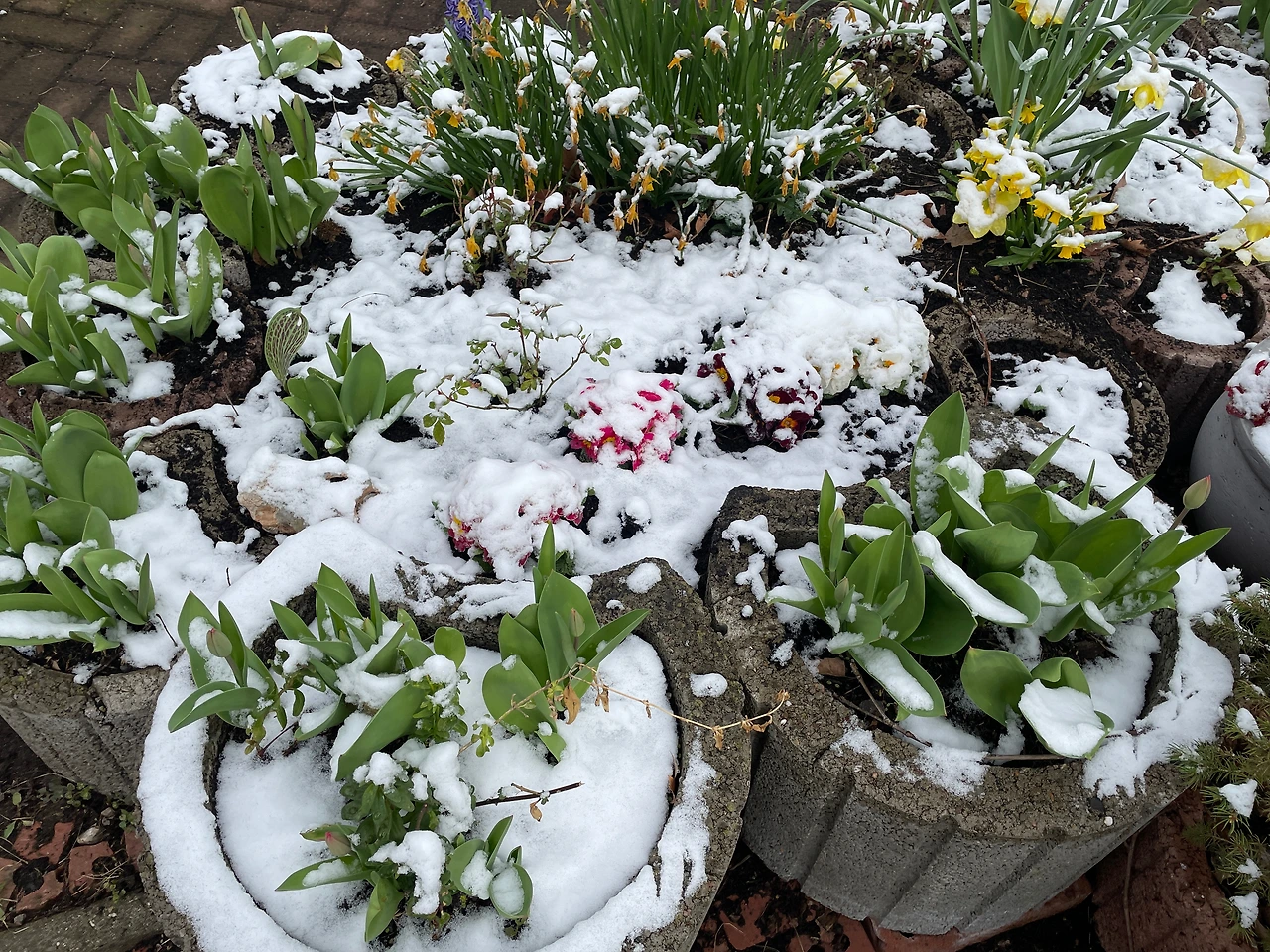 정원에 심은 알록달록한 봄 꽃들은 밤새 내린 눈이 덮여 흙에 심은 것이 아니라 눈에 심은 것 같아 보인다.