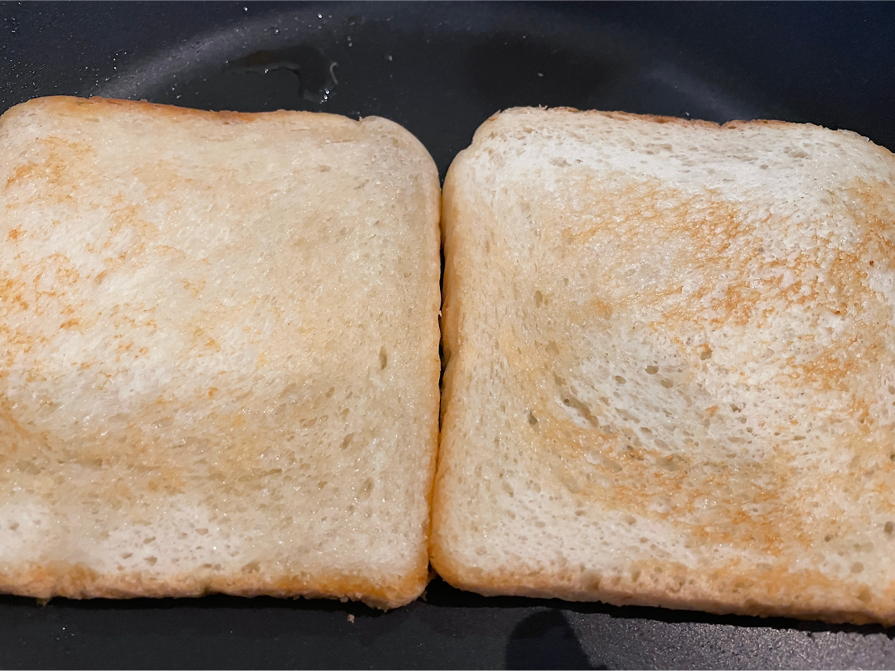 달구어진 프라이팬에 토스트 빵 두 개를 양면 골고루 노릇하게 굽습니다.