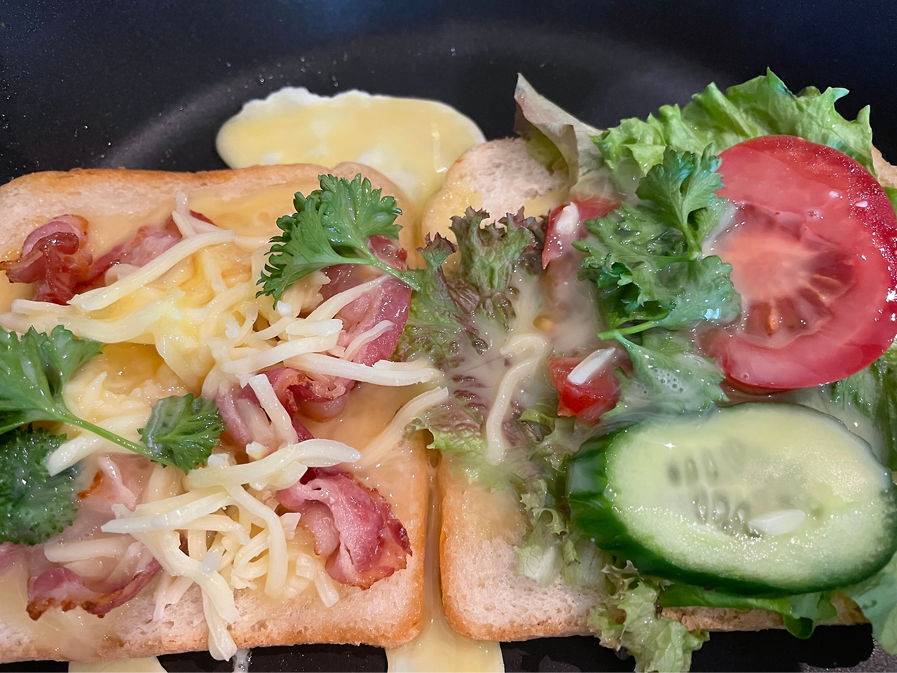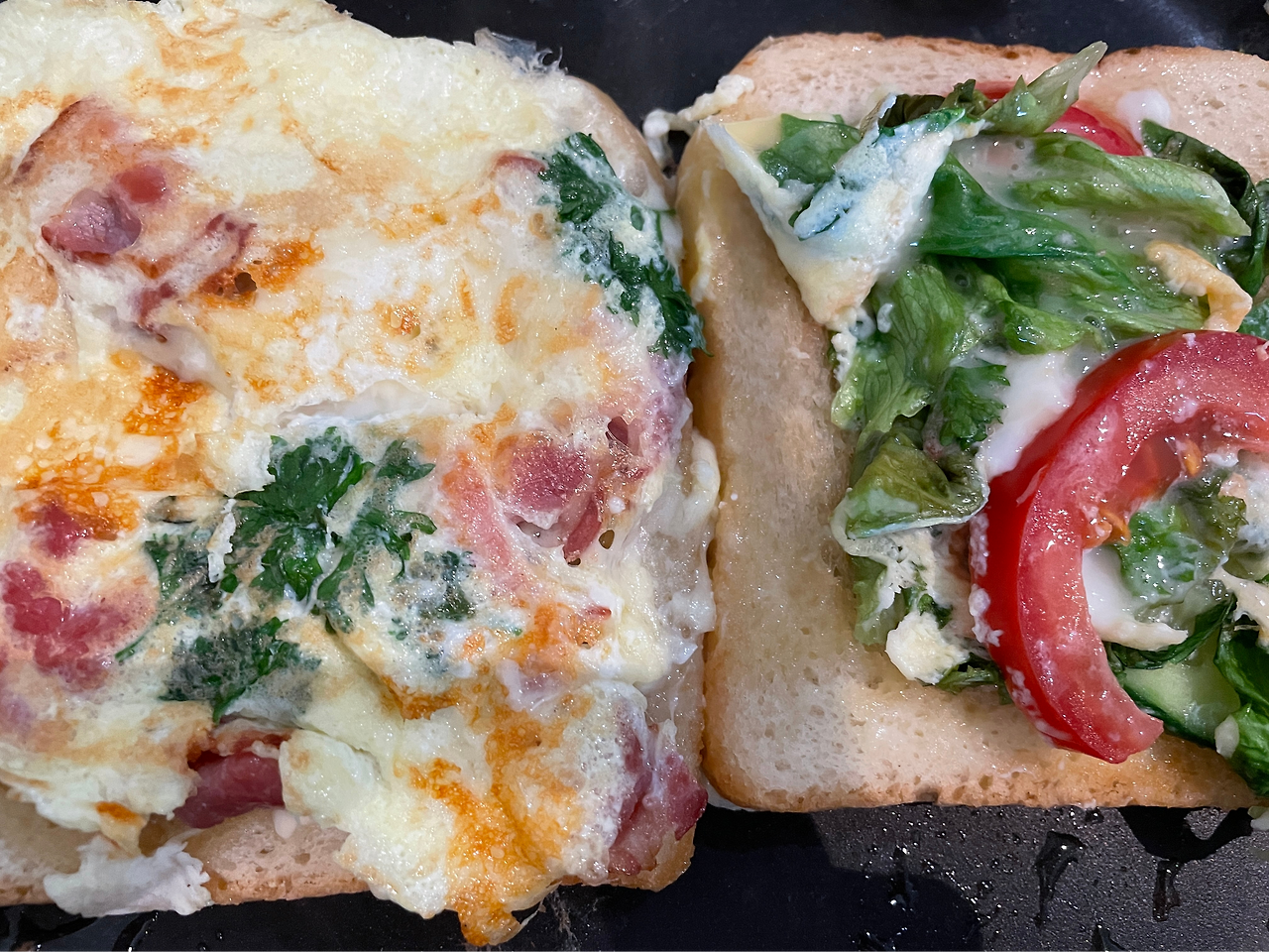 '계란 이불 덮은 바삭 베이컨 토스트'