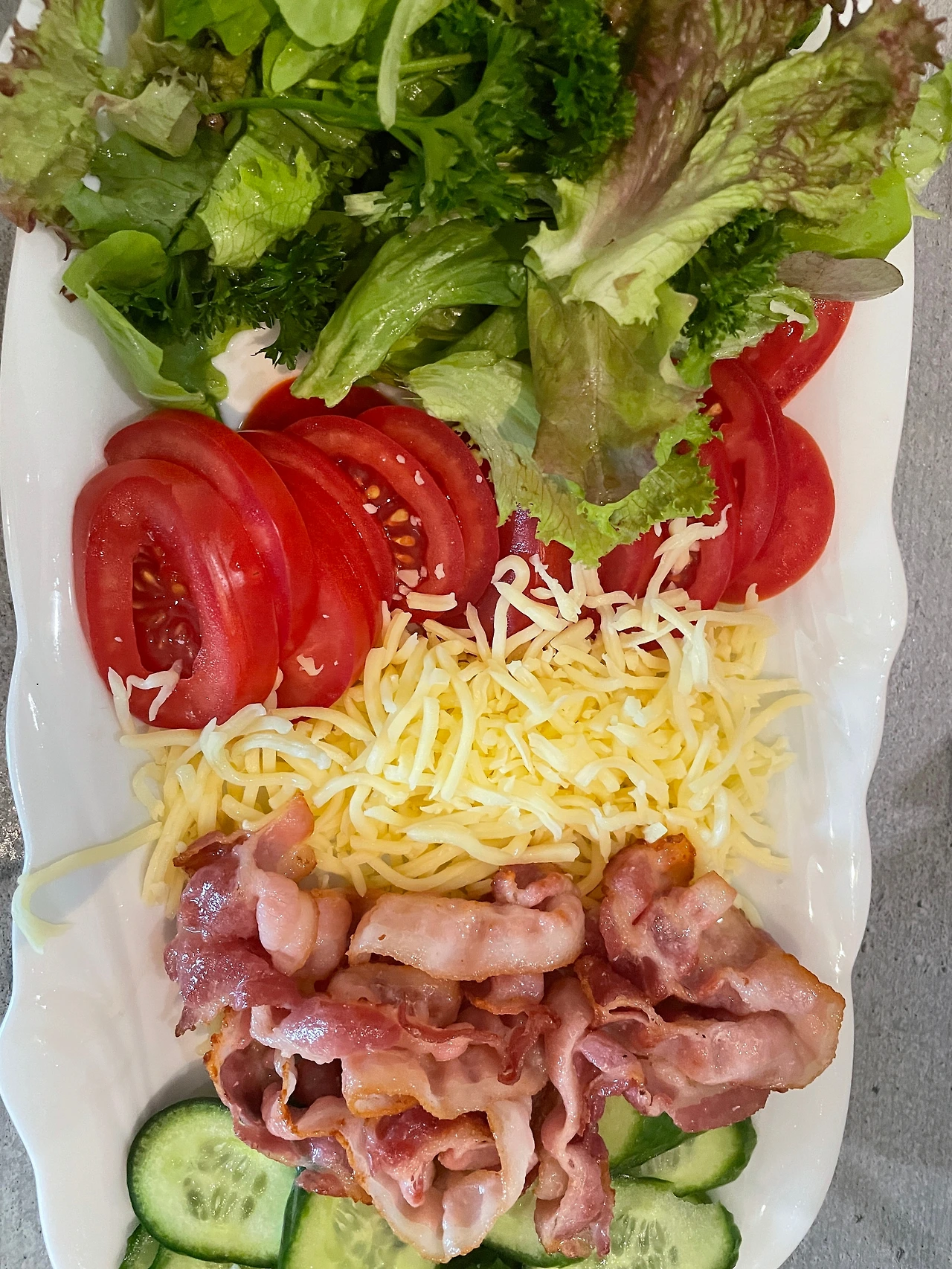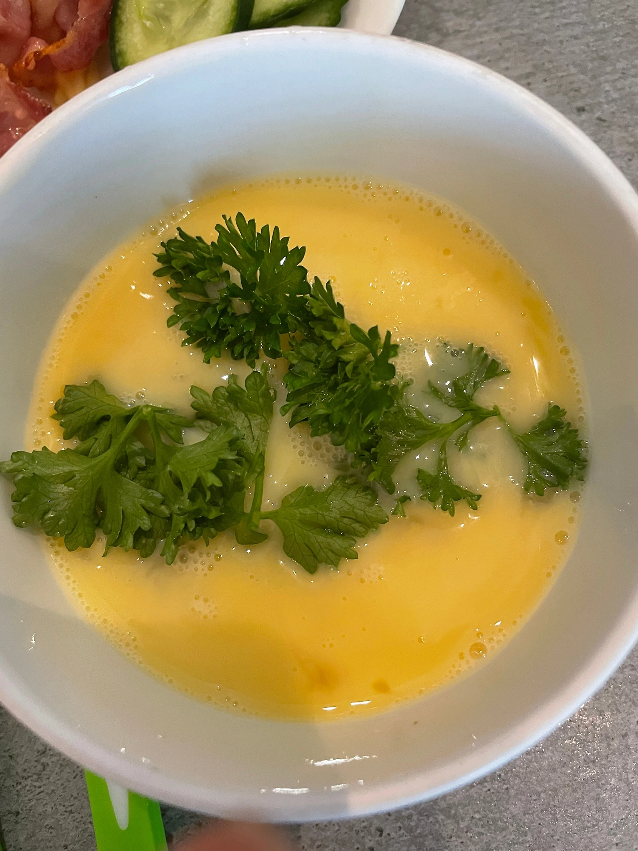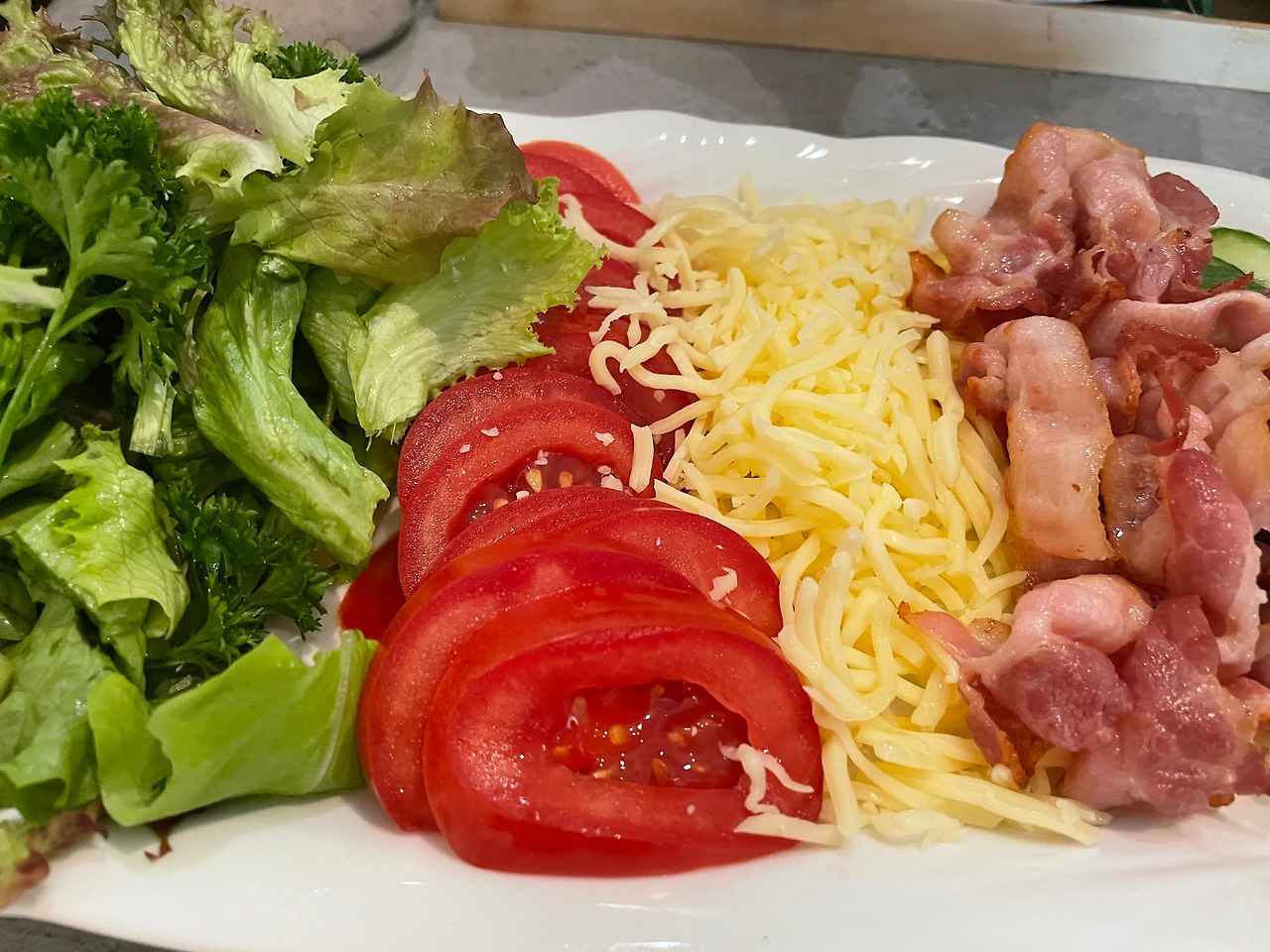 요렇게 각 채소 재료들을 썰고 베이컨을 바싹 하게 구워 큰 접시에 차례로 담아 두고 계란 풀어 소금 조금 넣고 파슬리 넣으면 준비 끝~!