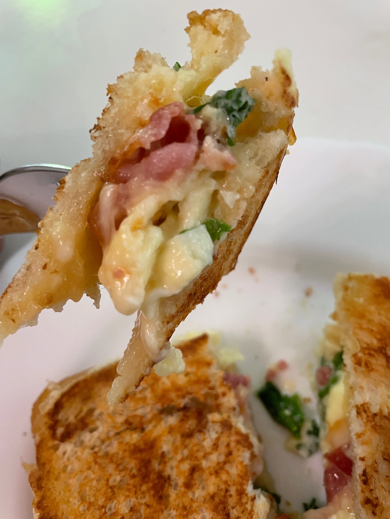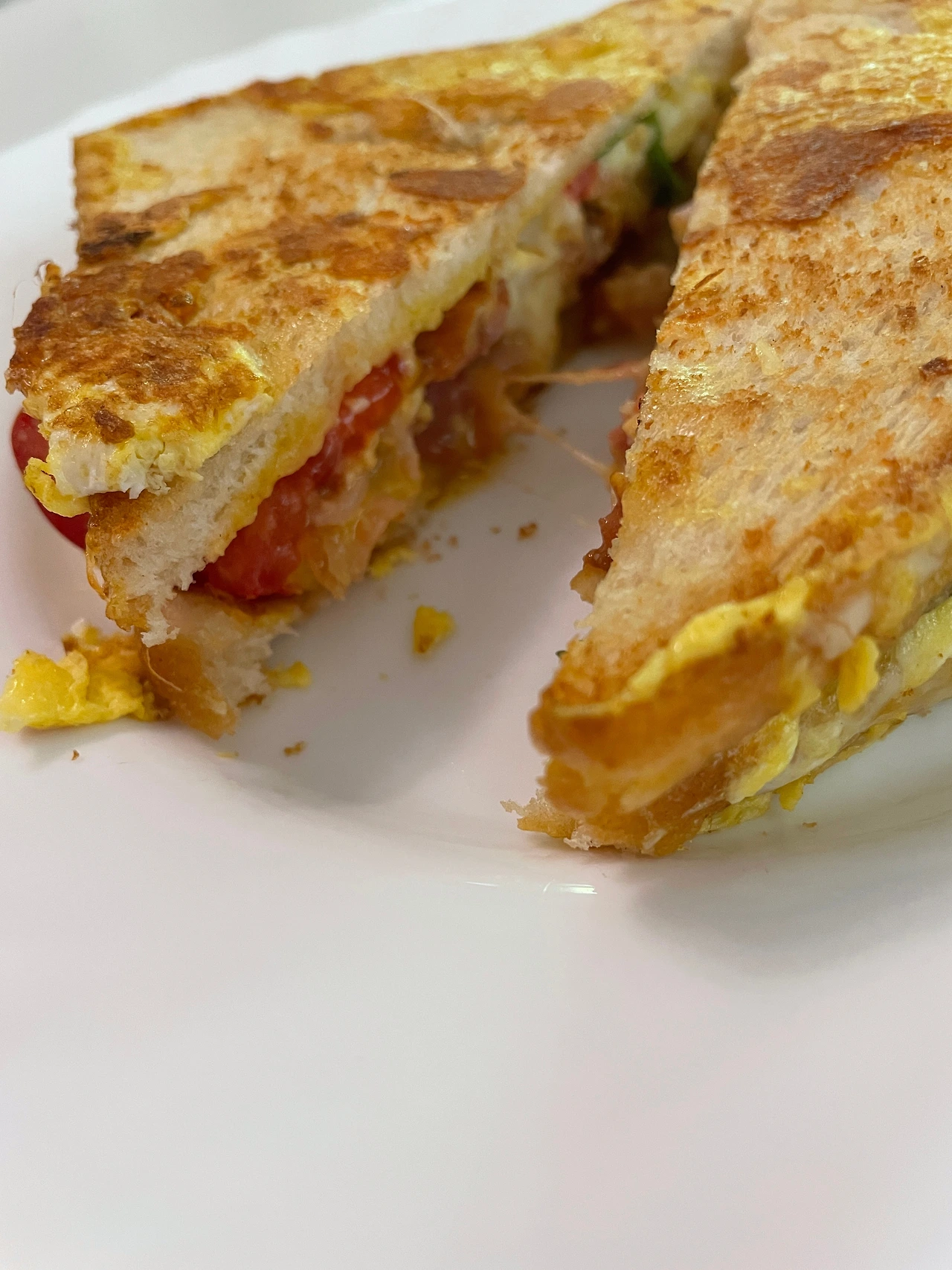 요렇게 노릇노릇한 계란과 하얀 모자렐라 치즈가 토스트 속 재료들을 흐트러지지 않게 모아 주고 맛난 모습을 만들어 줍니다.