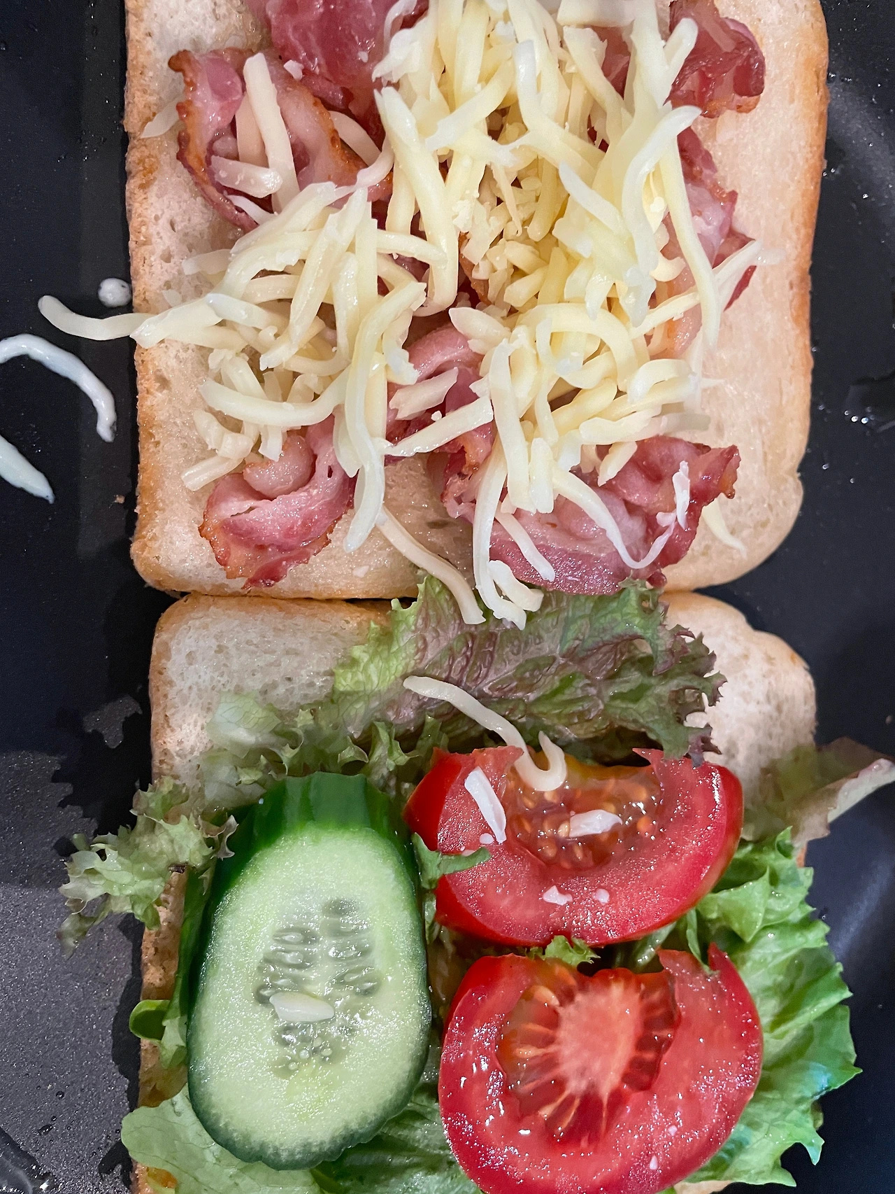 토스트 빵 한쪽에 상추 위에 토마토, 오이 얹고 다른 한쪽에는 바삭하게 미리 구워둔 베이컨을 얹어요.