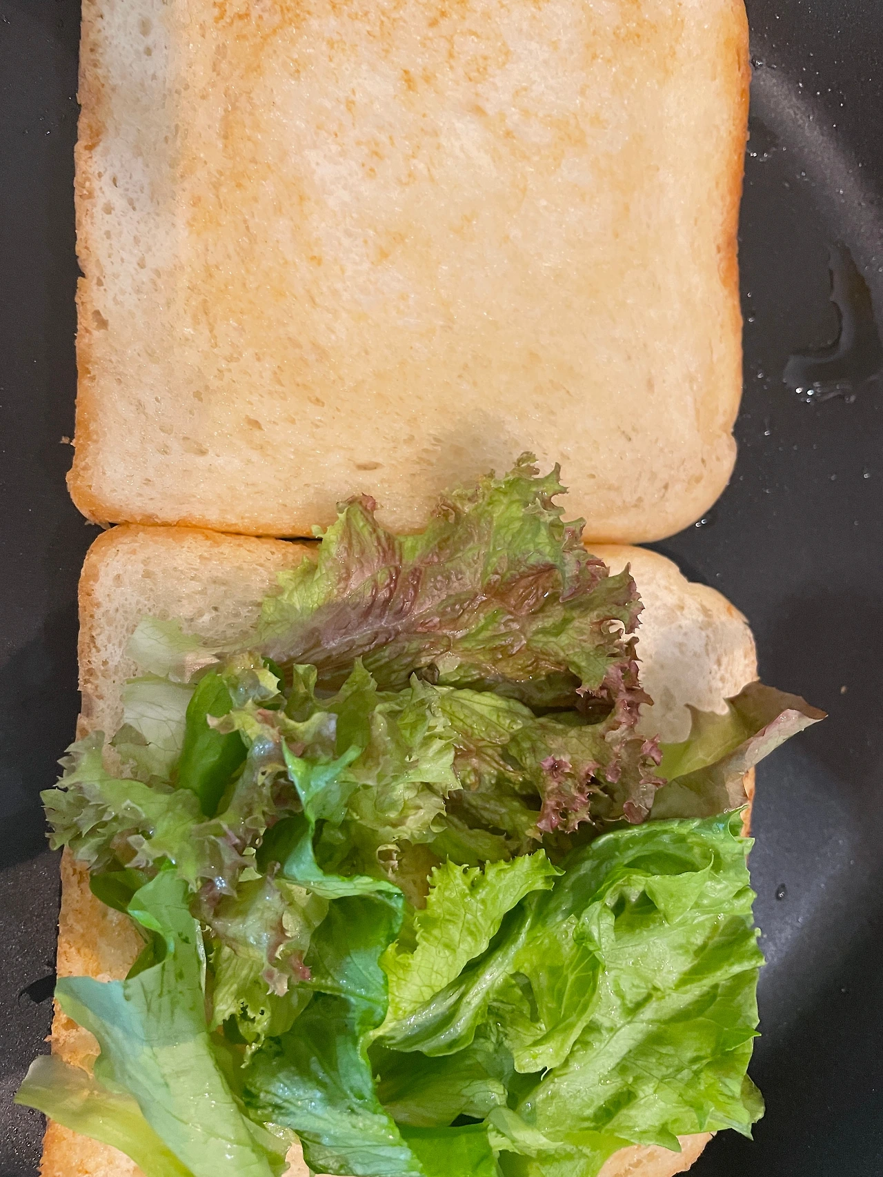 노릇노릇한 토스트 빵 위에 텃밭에서 따온 야들 야들 상추를 깔아 줍니다.