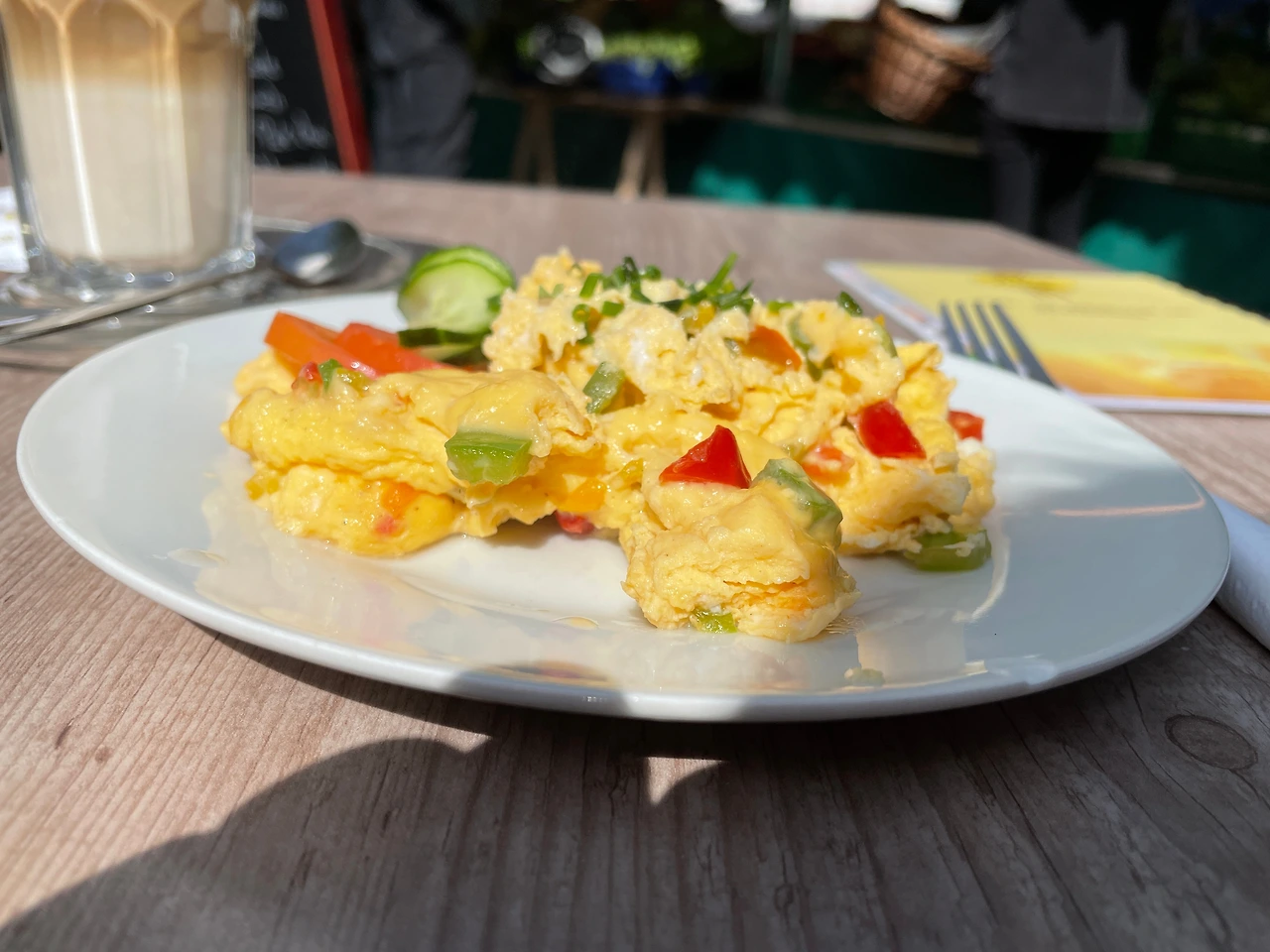 몽글몽글한 라테의 거품을 삼키며 노란 계란과 색색의 피망을 입속에 넣는다.