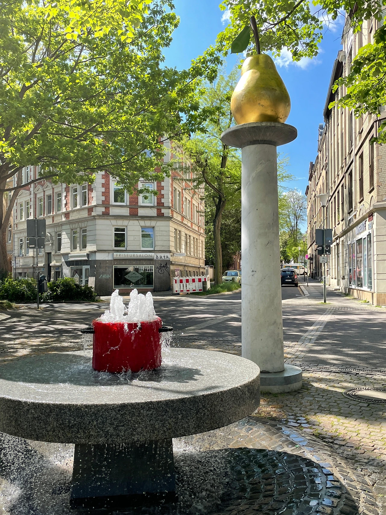 가스대 위에서 물 끓이듯 뽀글뽀글 하얀 물줄기가 오르내리는 빨간색 솥모양의 작은 분수와 금색 사과와 배가 반짝이며 얹어 있는 기둥 사이로 광장이 시작된다.