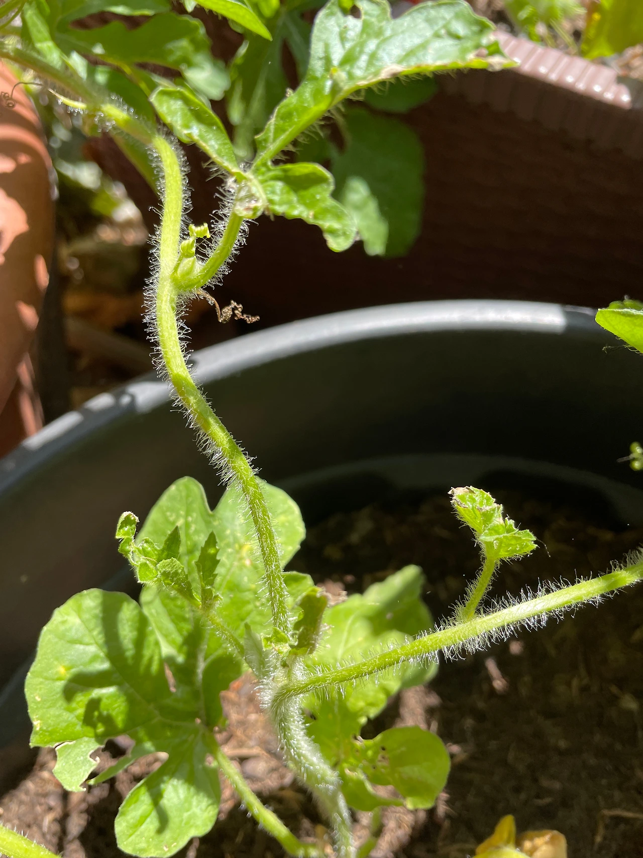 잎이 나오고 자라고 있기는 하지만 어떤 모양의 얼마만 한 수박이 열릴지는 아직 미지수다.