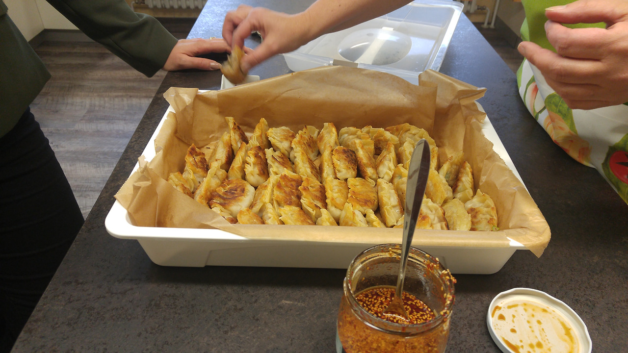 시킬 수 없어 아침 일찍 만두 빚어 구워서 한판