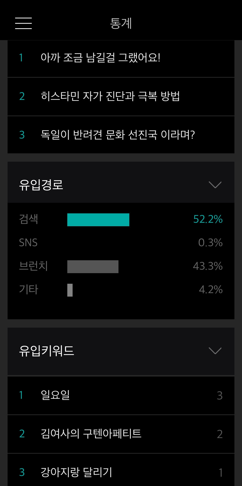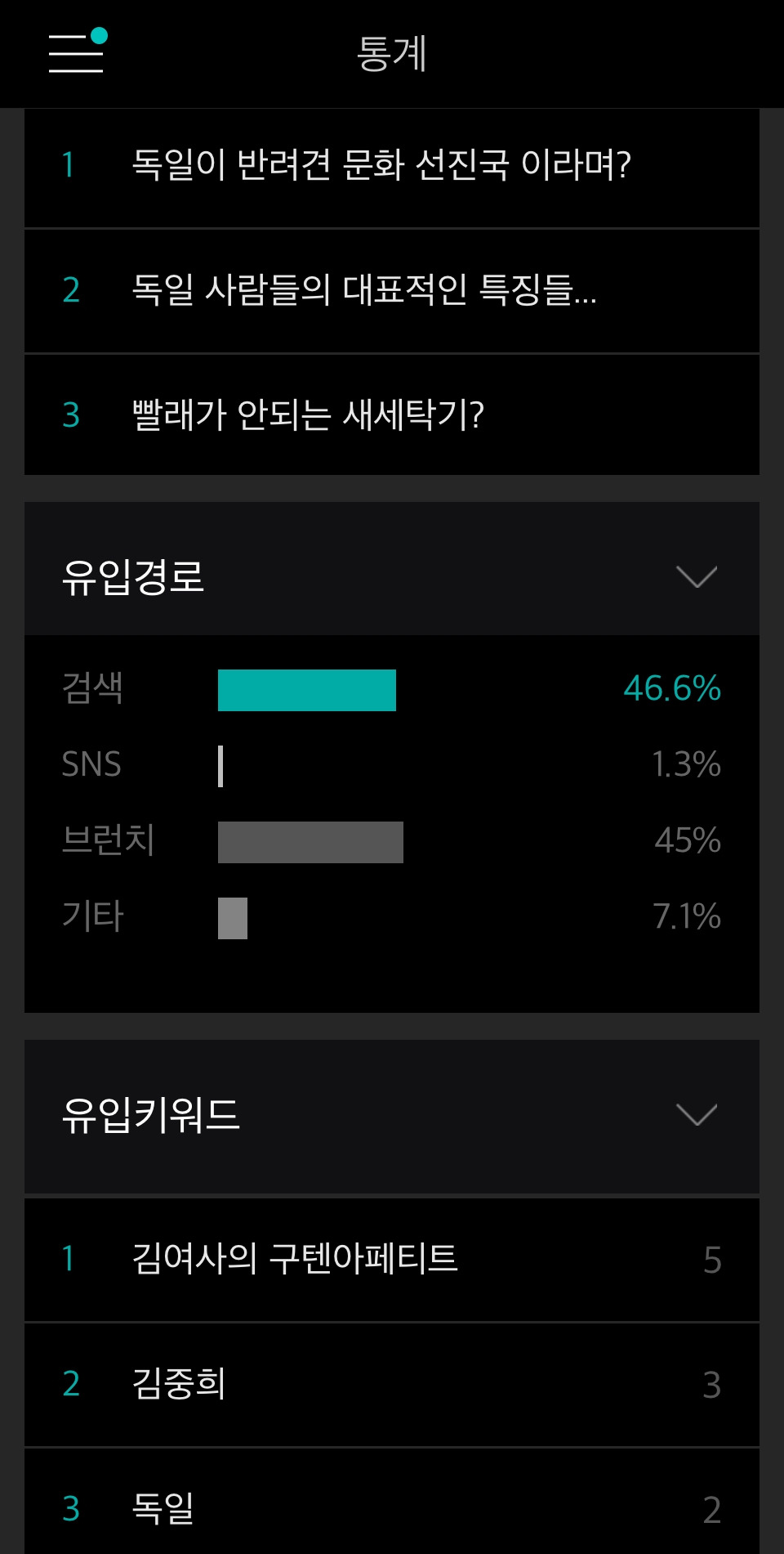 조금 더 자세히 설명해 보자면 통계 에는 유입 경로라는 것이 있어 독자들이 검색을 통해서 또는 sns를 통하여 아니면 브런치를 통해서 그도 아니면 기타를 통해서 유입되었는지 알 수가 있다.