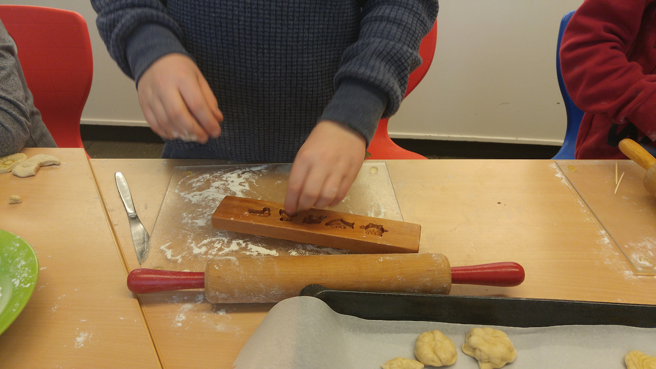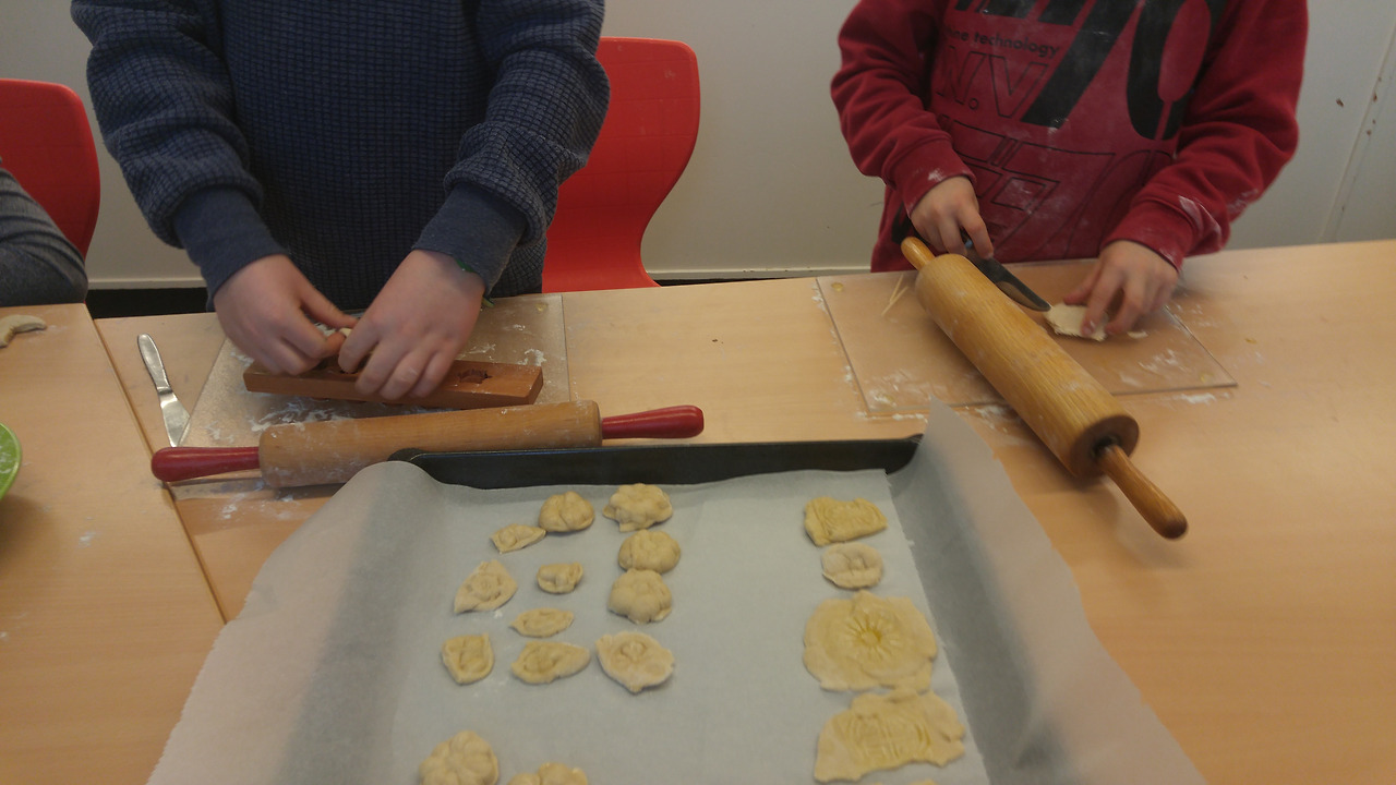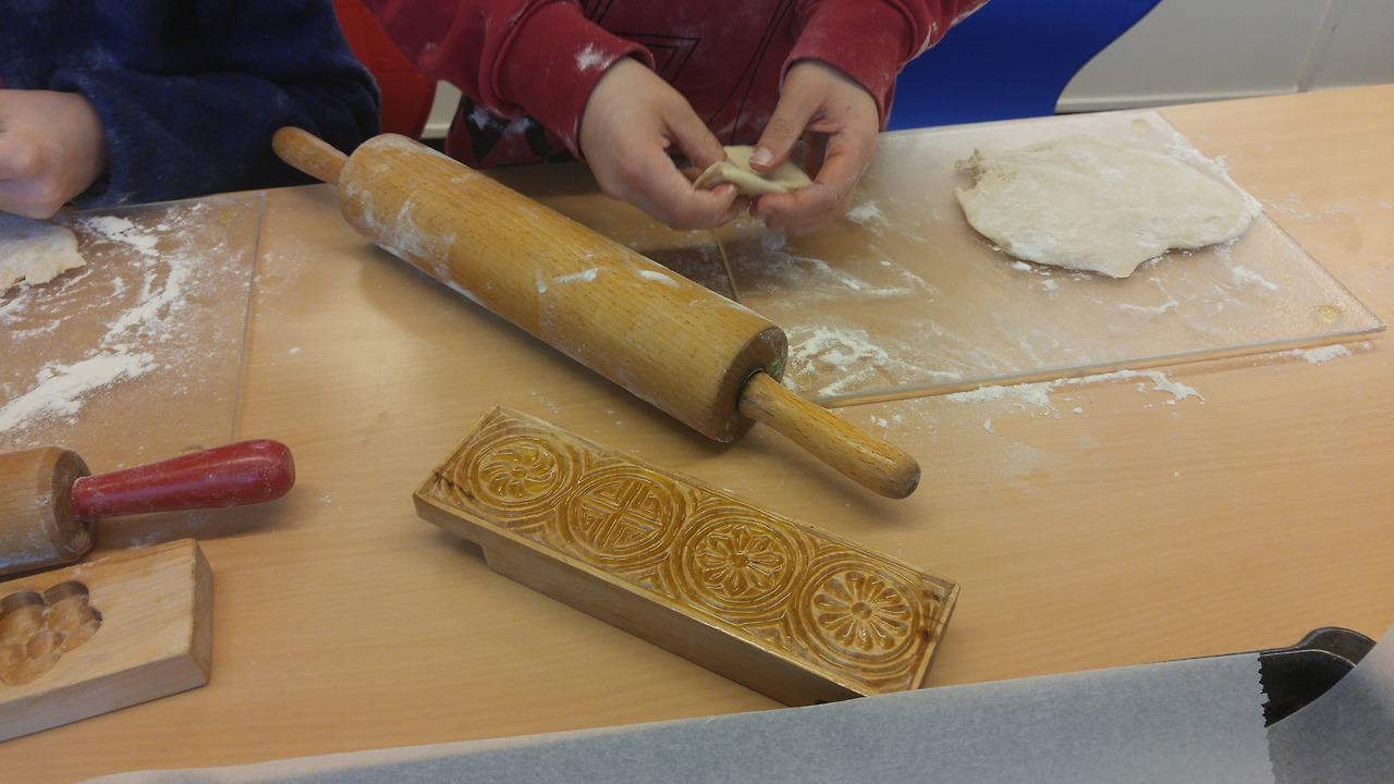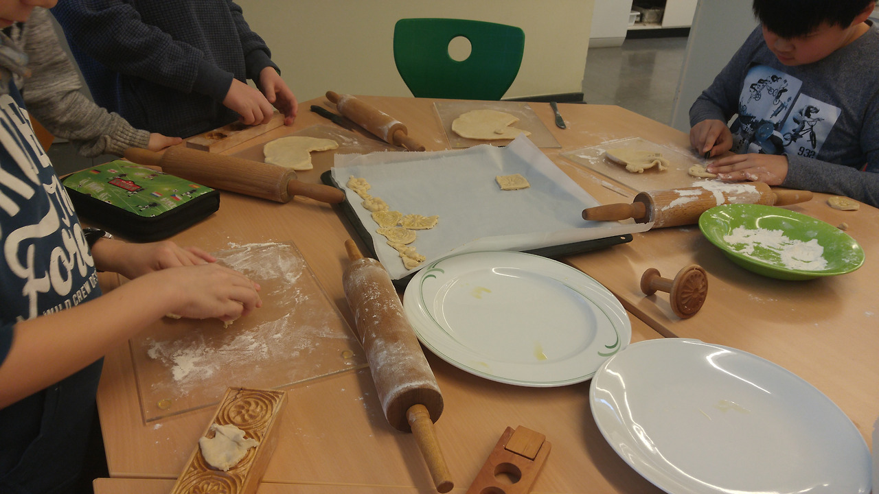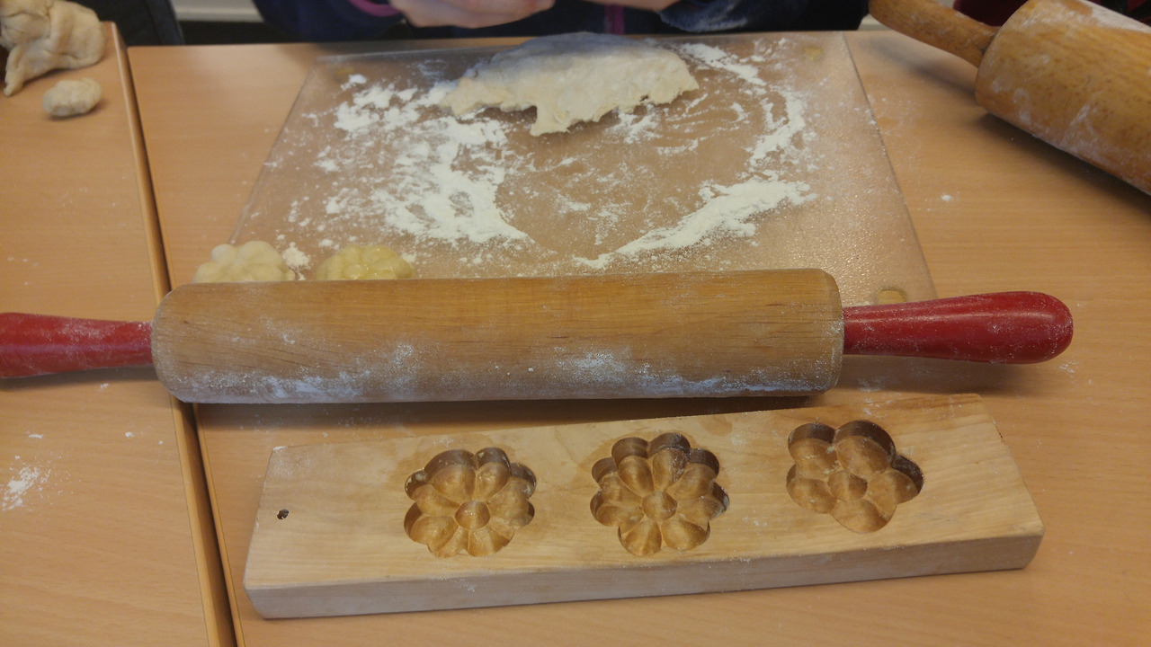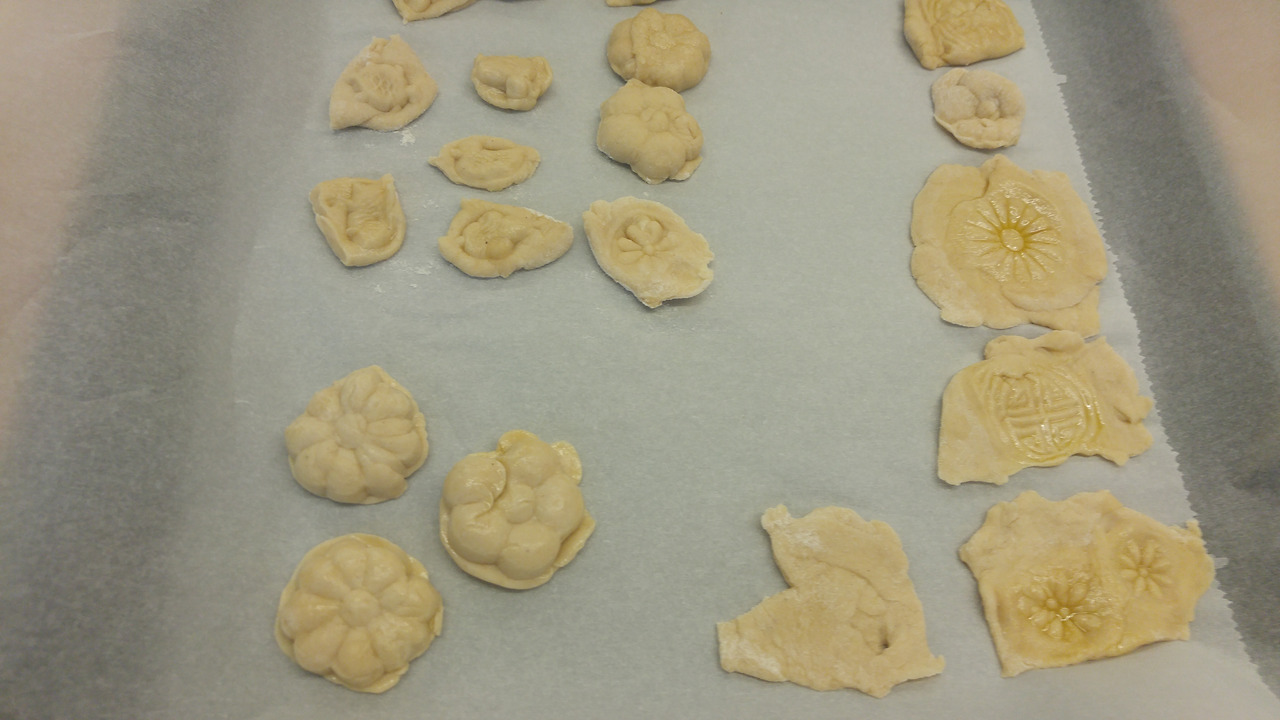 밀가루 폴폴 날리며 만든 꽃 모양, 새 모양, 등의 바삭한 과자를