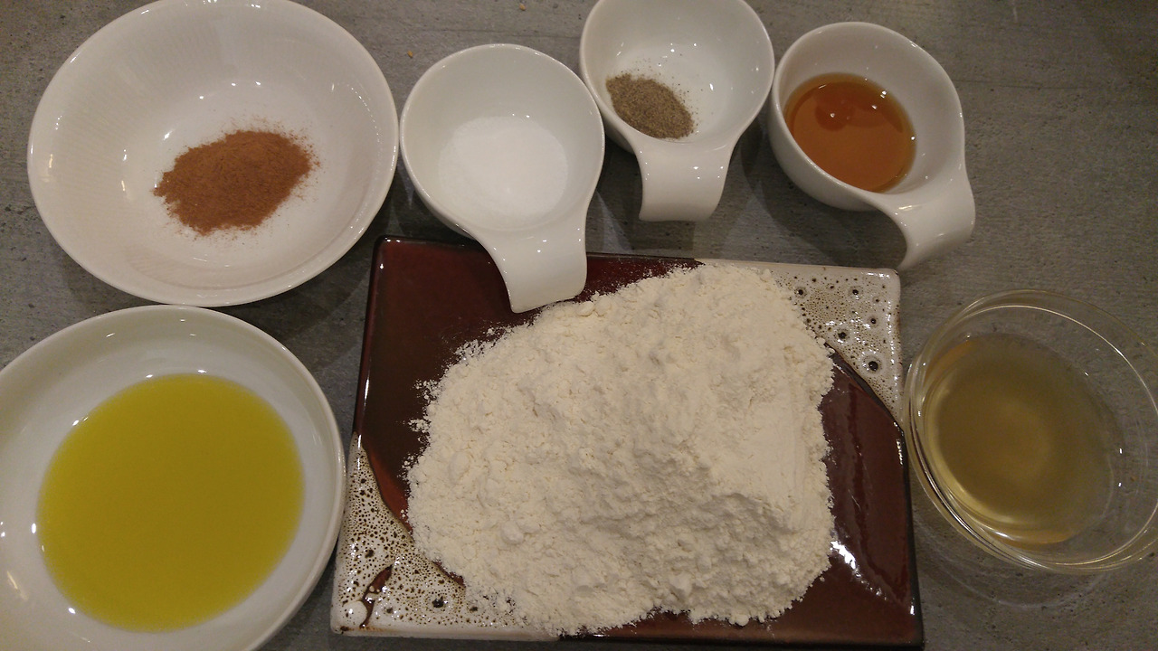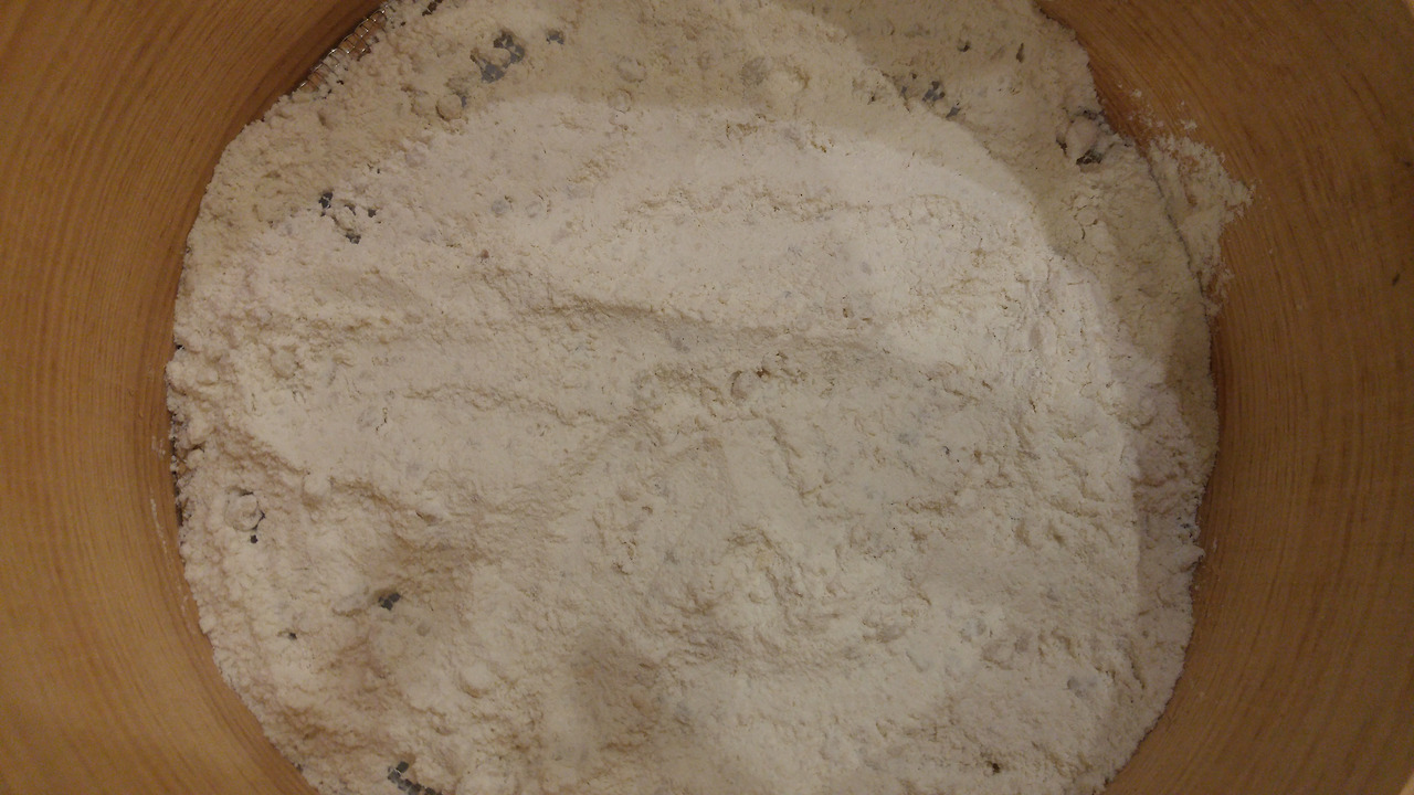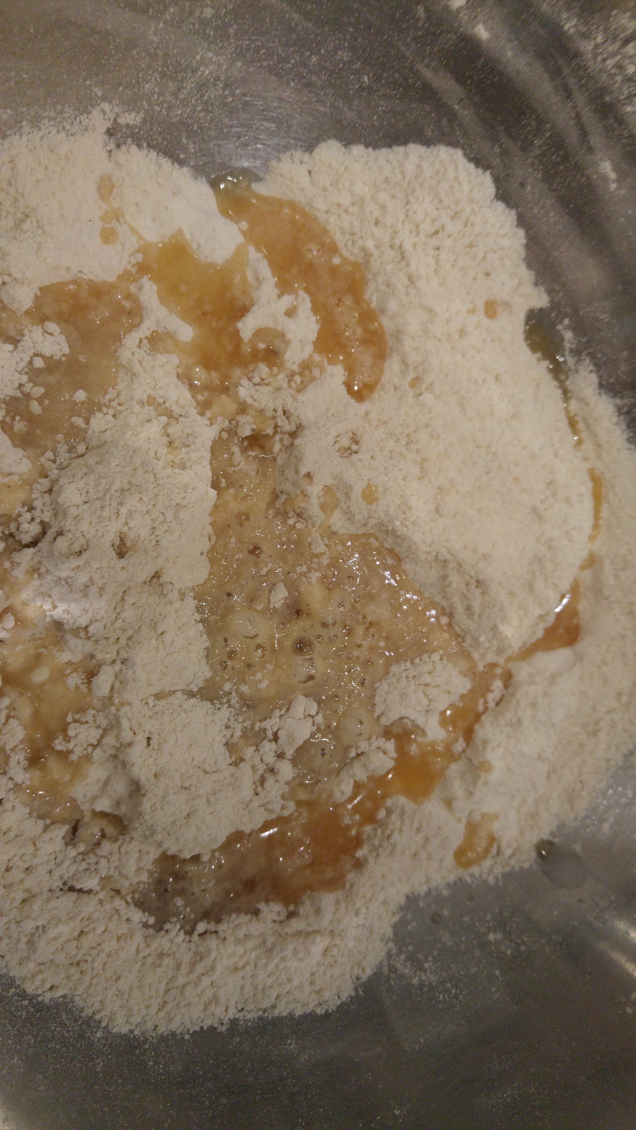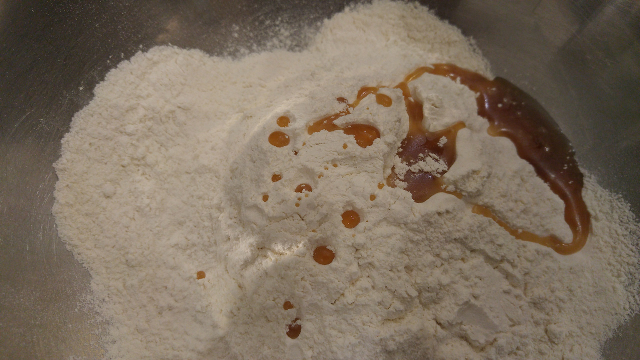 2. 기름 섞인 밀가루에 식힌 생강차, 꿀, 베이킹파우더를 고루 섞어