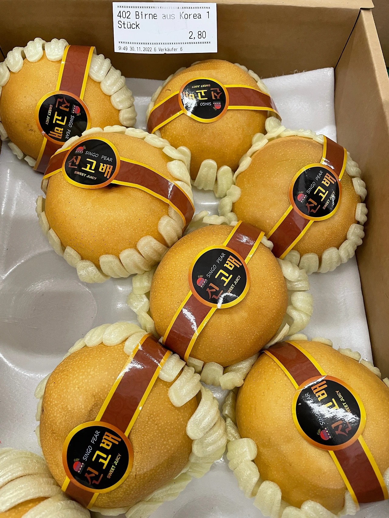 좀처럼 들어오지 않던 한국 배도 나와 있어 거금 들여 두 알을 담아 왔다. 아니 부딪치면 멍들 새라 조심조심 모셔 왔다. 하나에 2유로 80 라니 비싸기도 했지만 매번 만날 수 있는 것이 아니라 언제 또다시 들어올지 모르니 더 귀할 수밖에 없다.