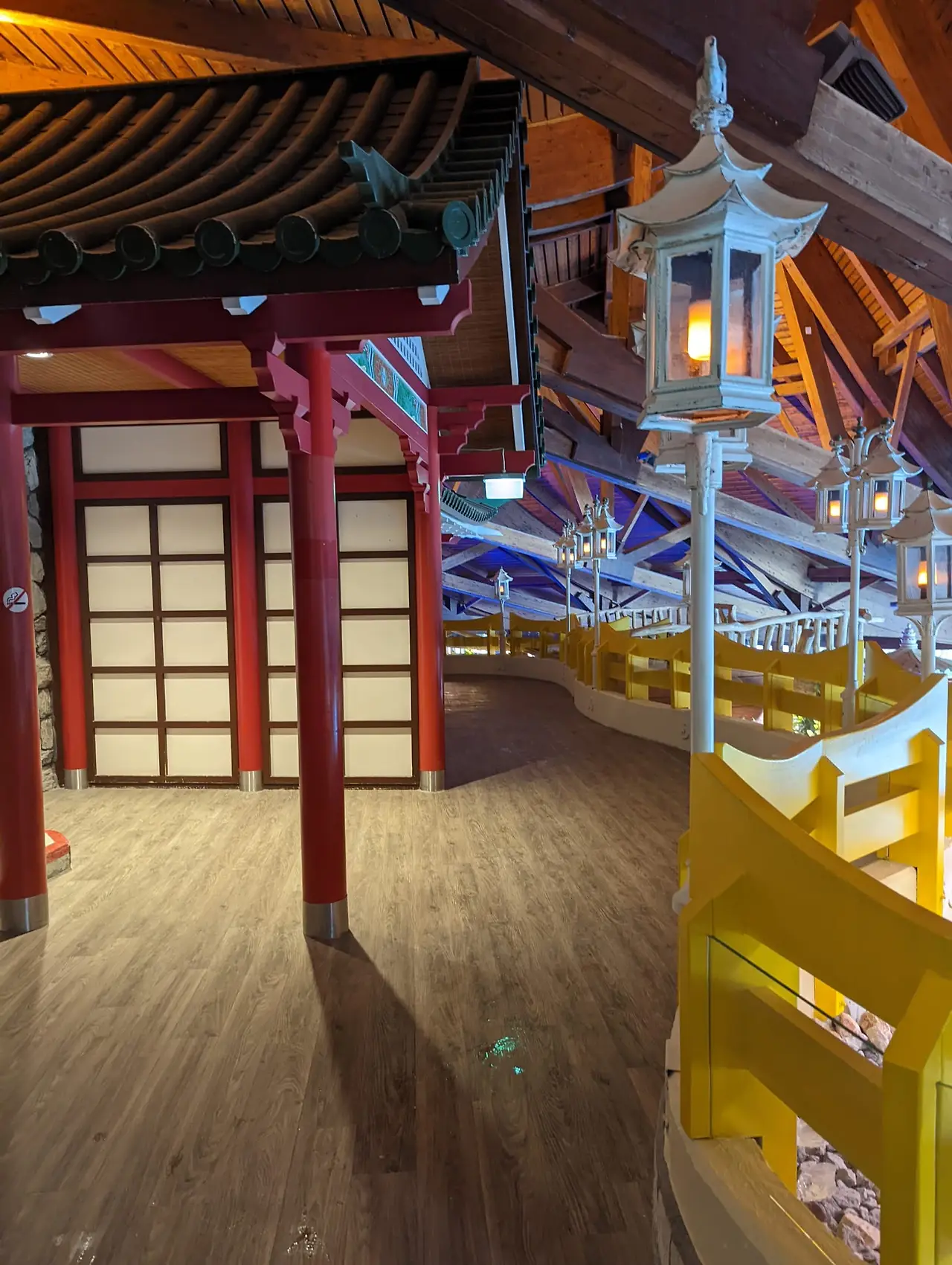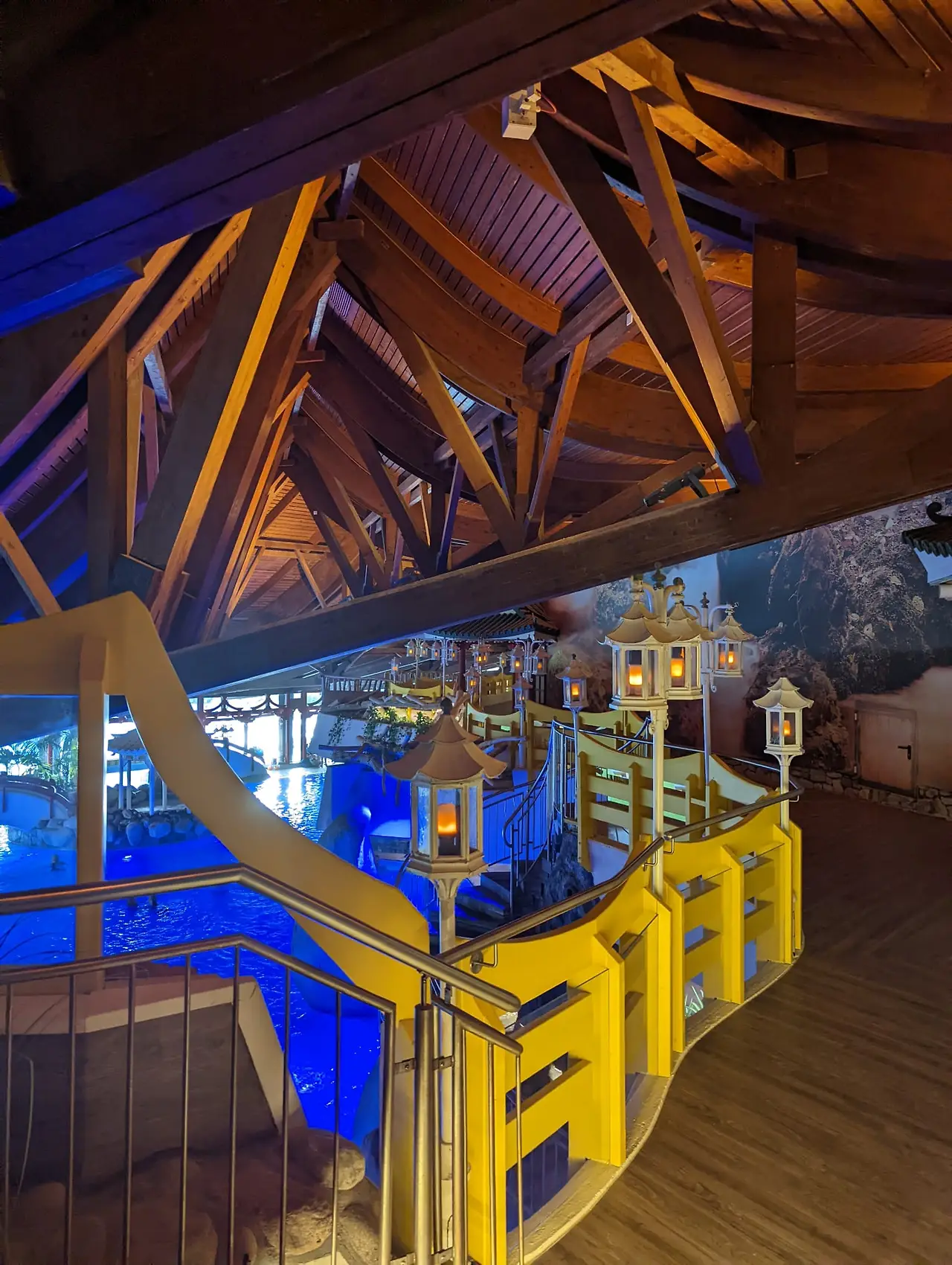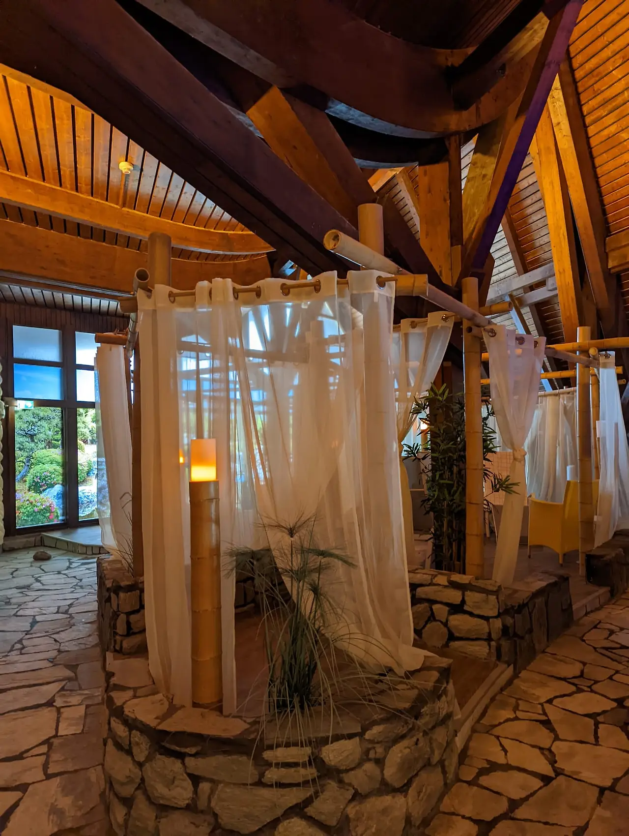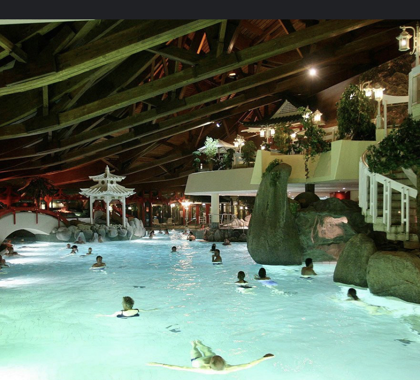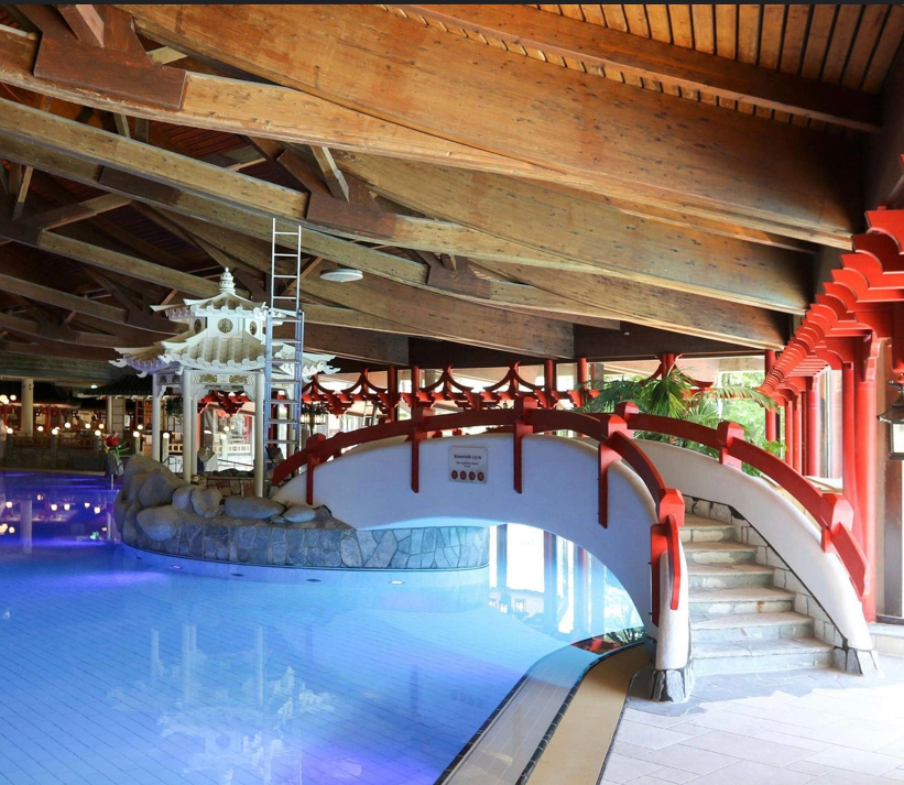 온천 수영장은 아시아 스런 분위기의 인테리어로 유명하다. 입구를 얼핏 보면 중국레스토랑 같기도 하고 또 안에 커다란 돌부처 등의 소품들을 보면 태국이 떠오르기도 하며 이층에 휴식공간은 일본 또는 인도네시아 같은 분위기를 띄기도 한다. 소금물 농도가 다른 수영장은 노천에 하나 안에 두 곳으로 세 군데로 나뉜다.