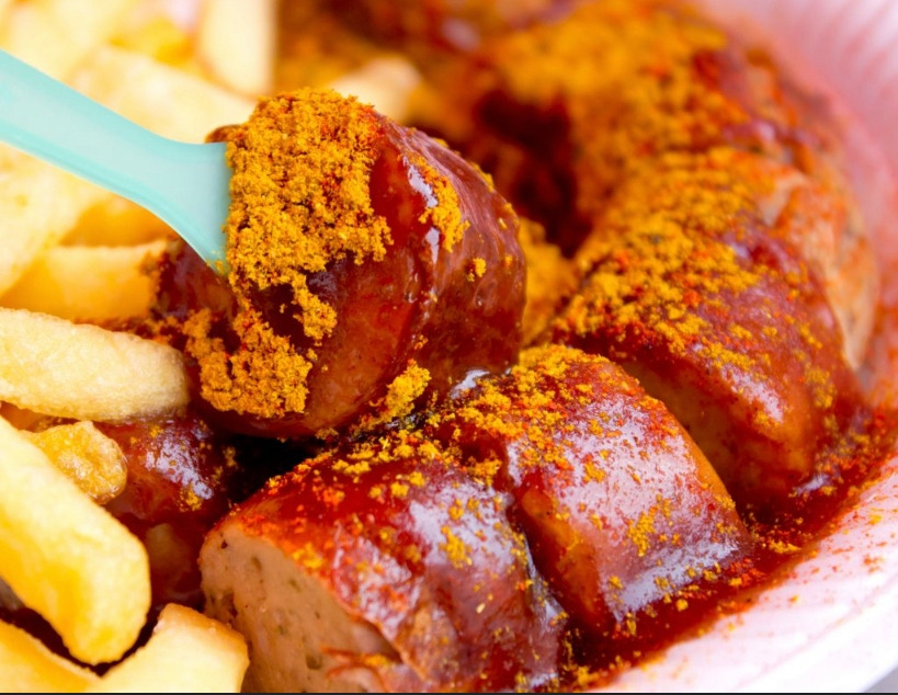 커리부어스트는 구운 소시지에 달콤하고 매콤한 맛의 빨간 소스를 얹고 그 위에 깨처럼 카레 가루를 솔솔 뿌려 풍미를 더한다 소스는 소시지뿐만 아니라 감자튀김을 찍어 먹기에도 그만이다.