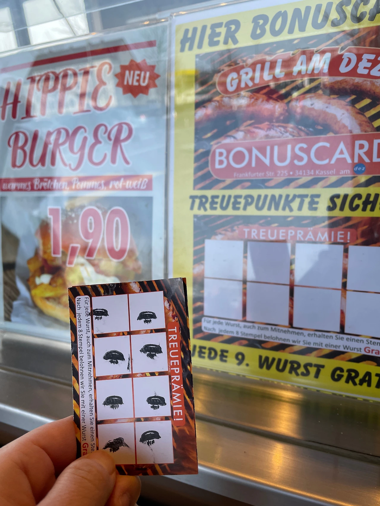 카드에 8개의 도장이 빼곡히 찍히면 Bratwurst 부랏부어스트 그릴로 구운 3유로 50 센트 짜리