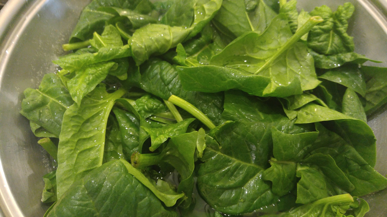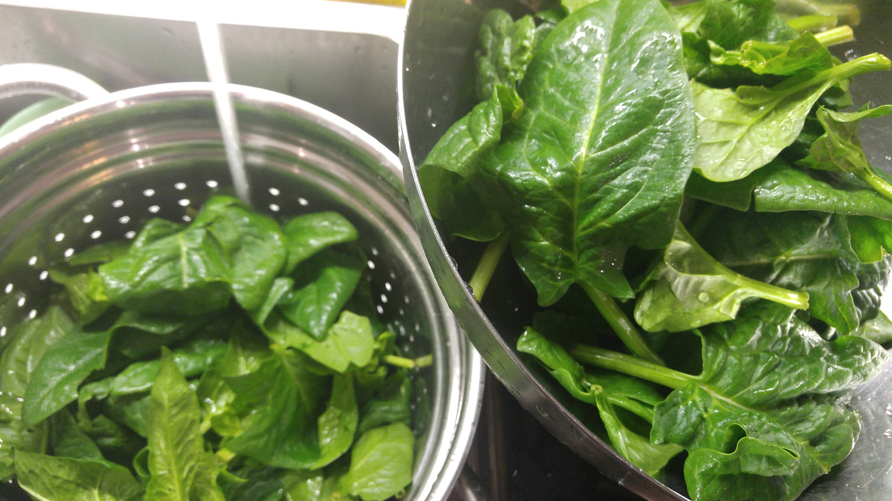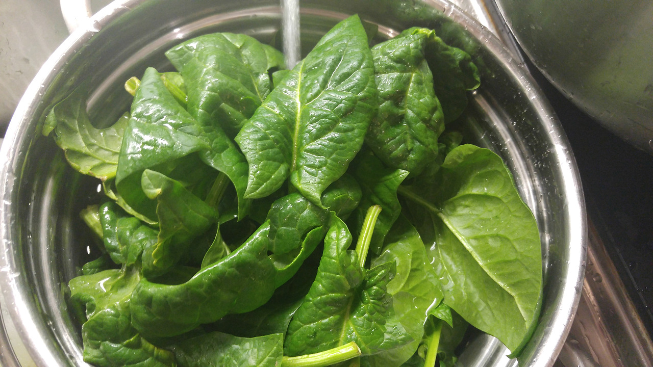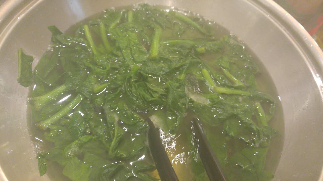 물이 끓는 동안 찬물에 시금치를 씻고 다듬는다.
