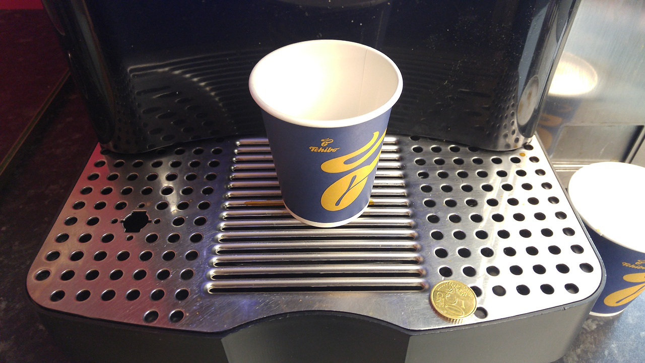 50센트짜리 동전 한 잎 넣고 종이컵 안에 커피가 차오르기를
