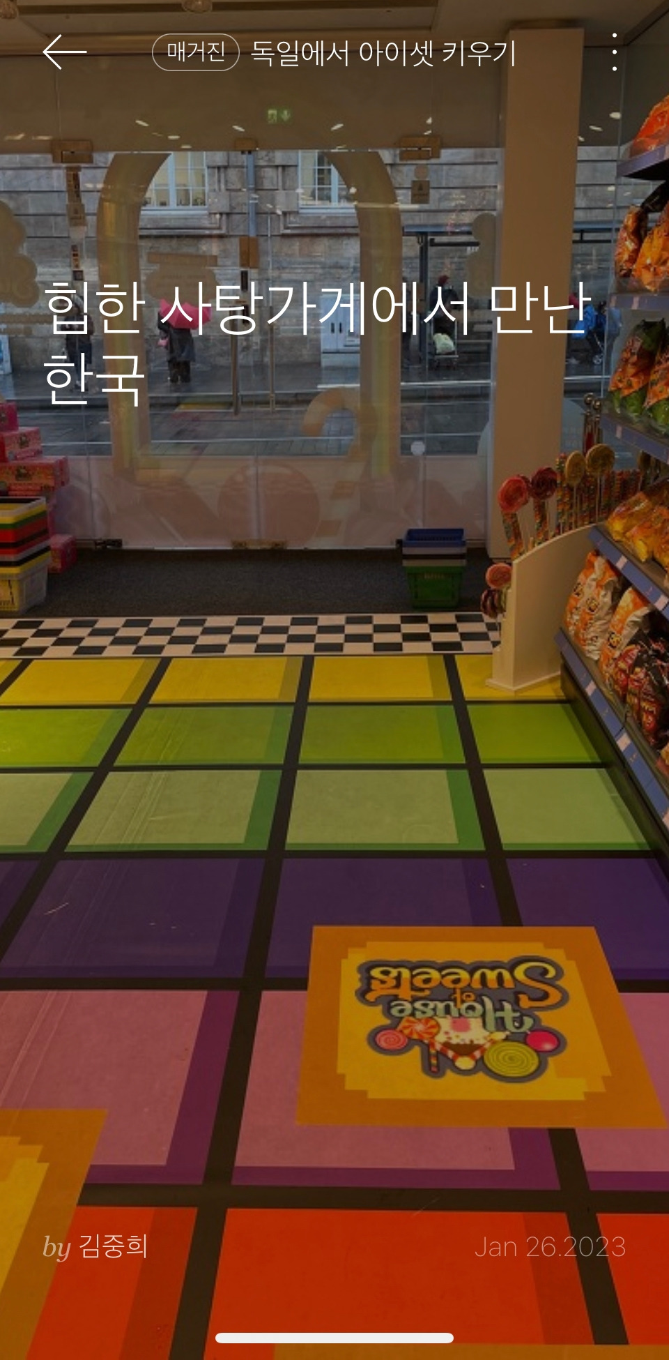 그 글은 우리 동네 새로 생긴 예쁘지만 비싼 사탕가게에서 문득 어린 시절 한국에서 내가 만났던 또 다른 사탕가게에 관한 것과 그 사탕 가게에서 만난 한국 라면과 과자에 관한 알록달록한 글이었다.