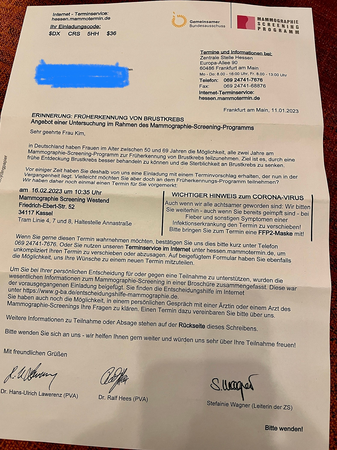 거기다 친절하게도 본인이 직접 병원에 예약을 하지 않아도 방사선과 병원에서 건강검진 날짜와 시간 그리고 병원 주소가 적혀 있는 편지를 집으로 날려 준다.