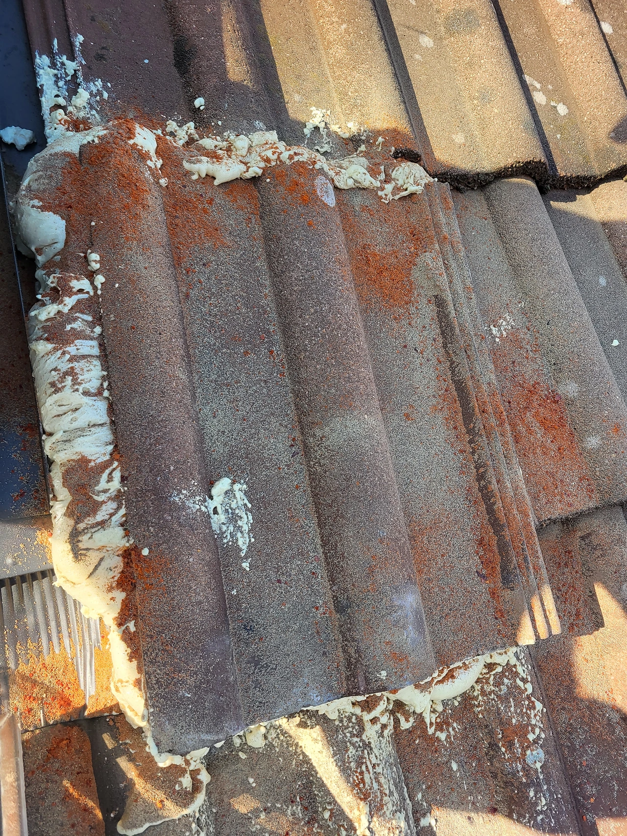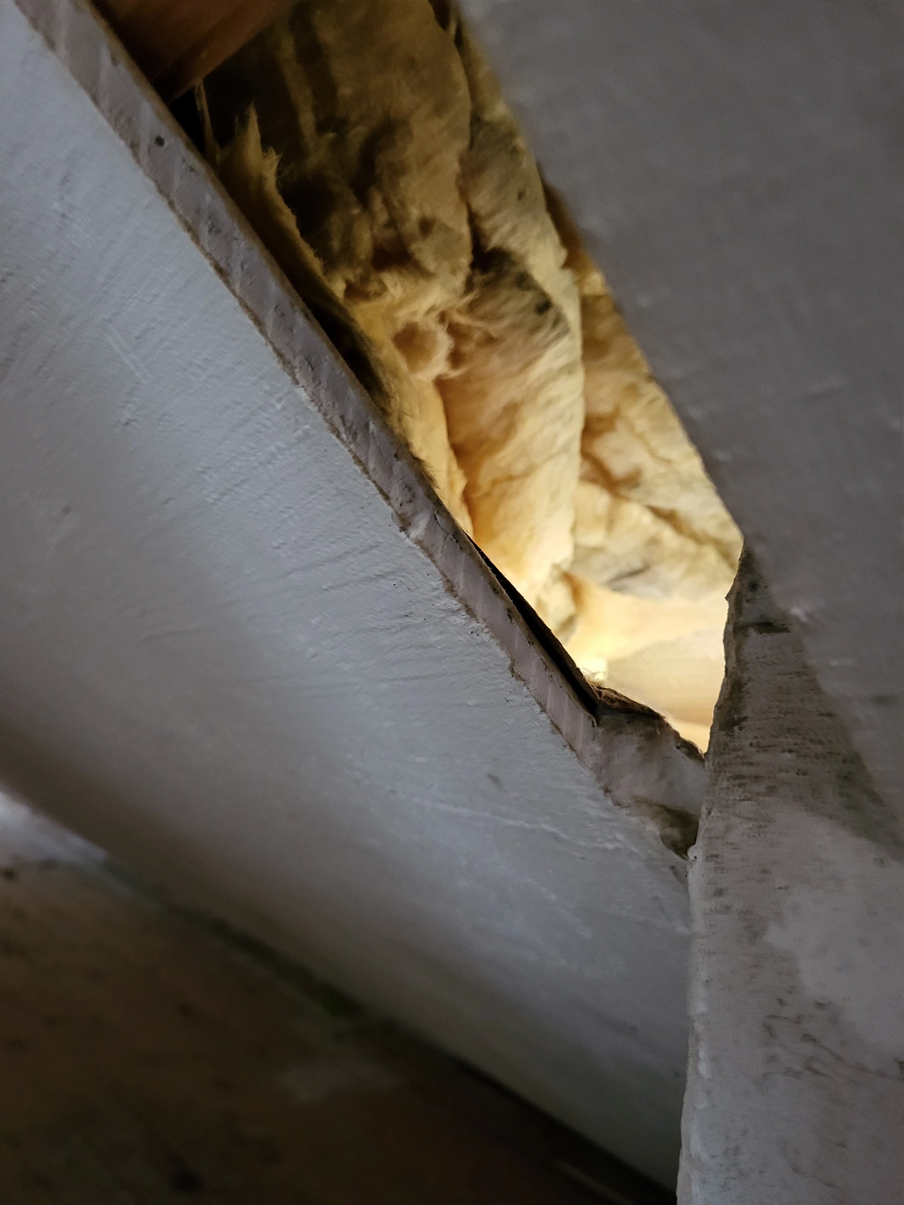 그리고 지붕 수리가 끝난 후에 다락방 벽을 갈라놓듯 뜯어 놓은 지붕 한쪽도 임시방편으로 노란색 거품 본드로 땜빵을 해 두었다.