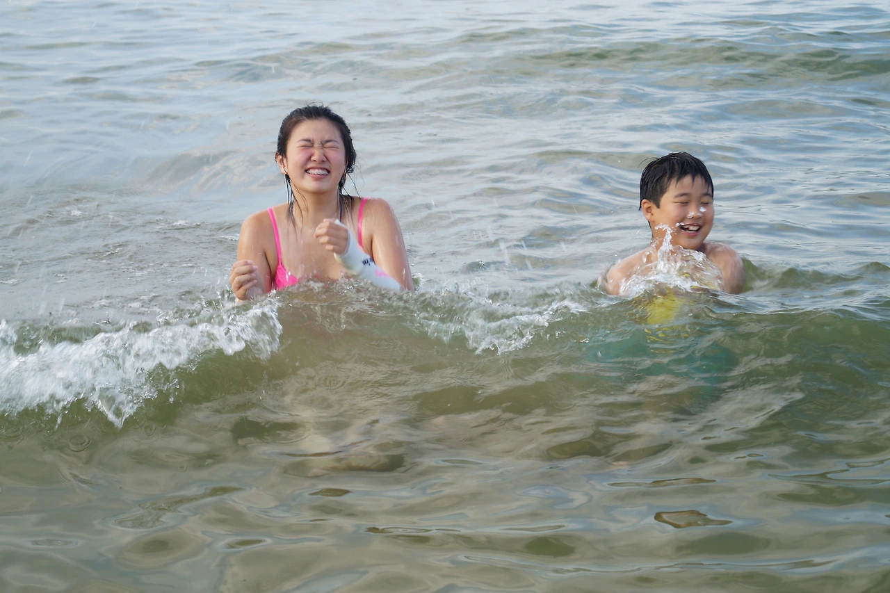 해변에서 일광욕을 즐기는 사람들과 넘실 대는 하얀 파도...