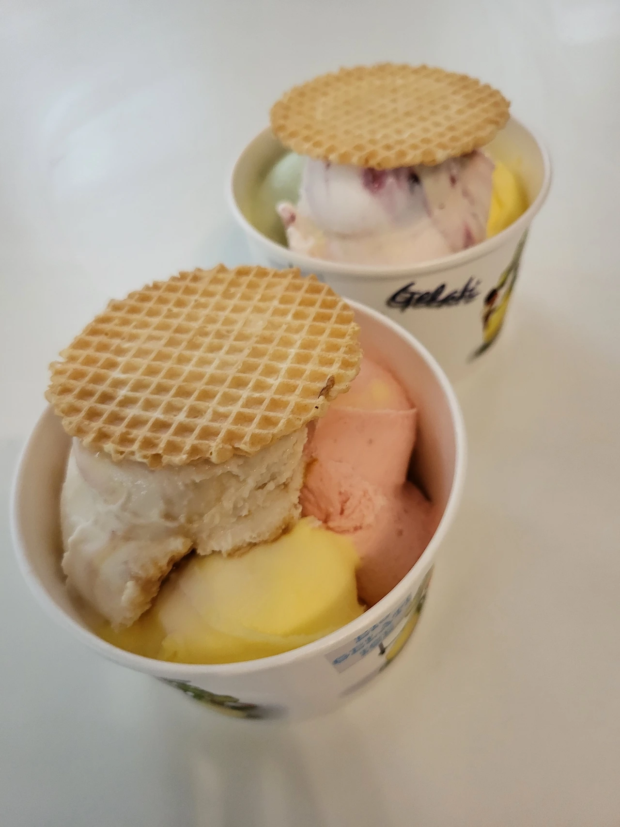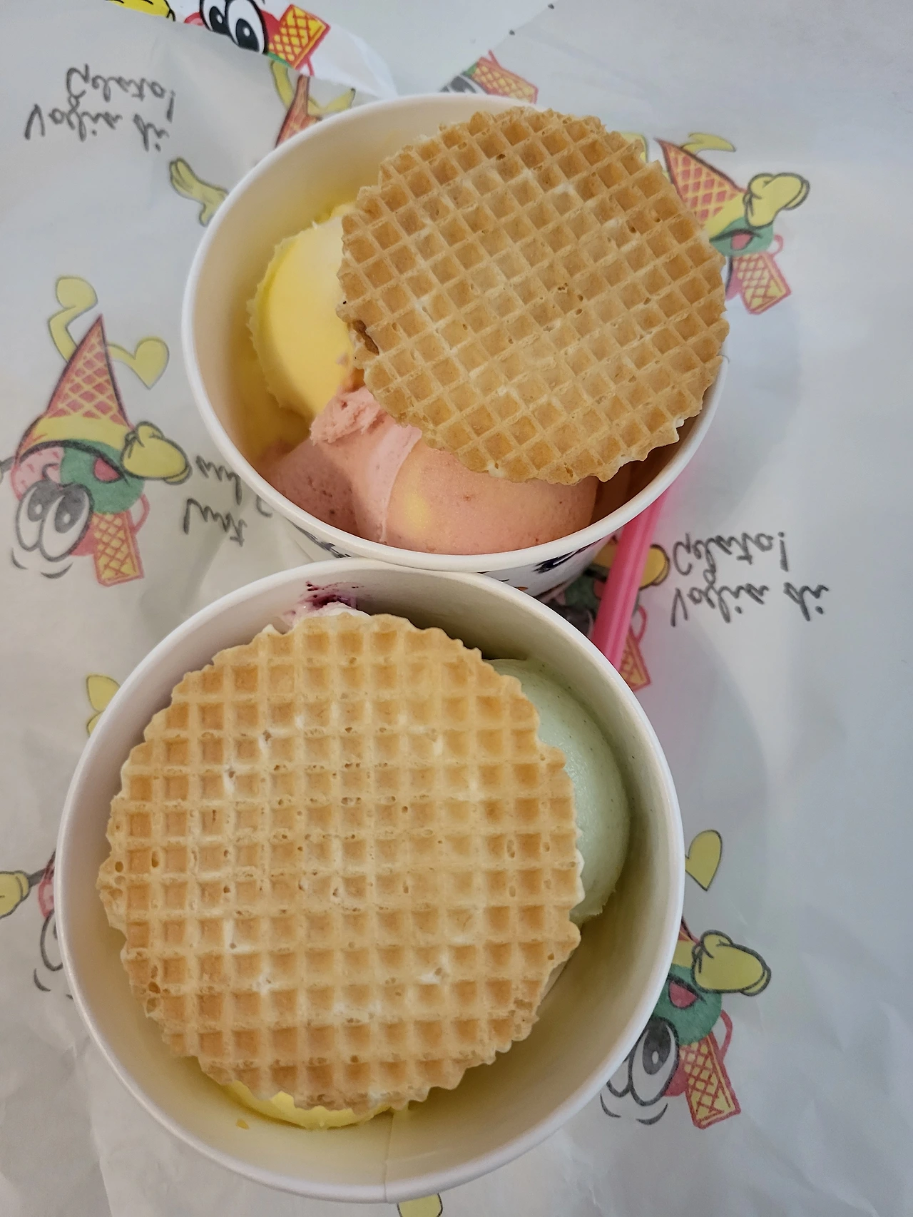 콘에 얹은 아이스크림 하나도 아니고 6가지 맛으로 두 컵 가득 담긴 것을 공짜로 받자니 환자 삥 뜯는 것 같고