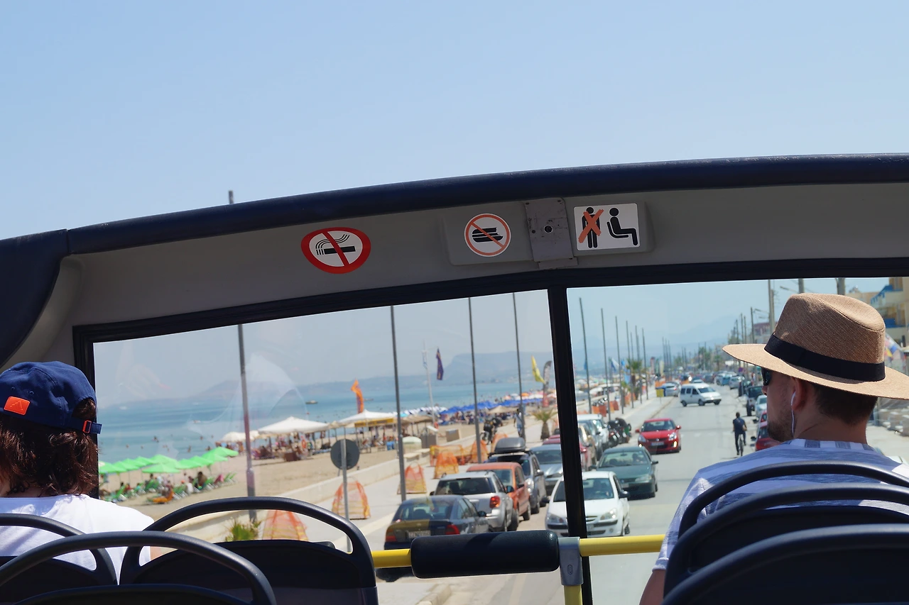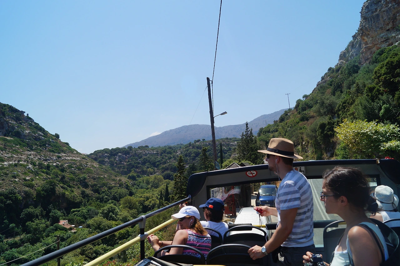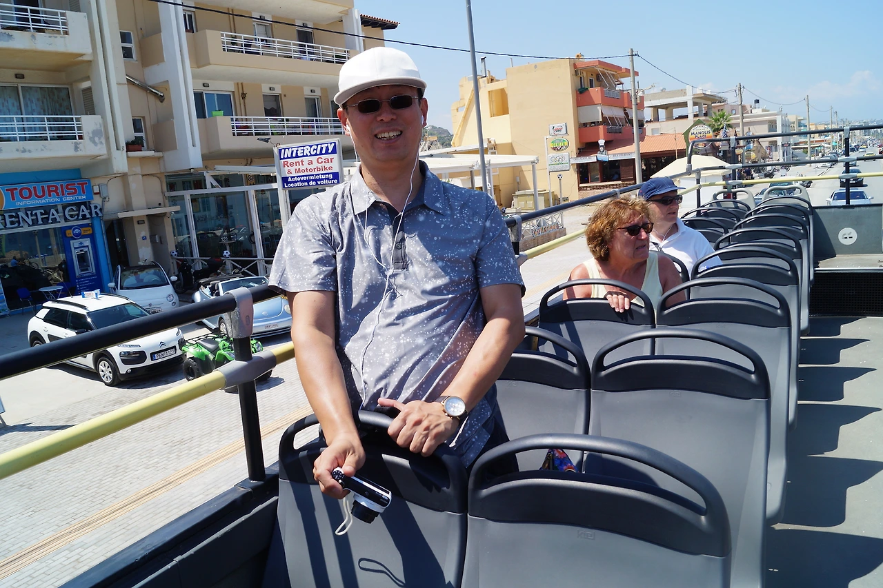 아이들을 달래 가며 여행객 들을 모아 관광버스로 크레타의 명소 구석구석을 두루