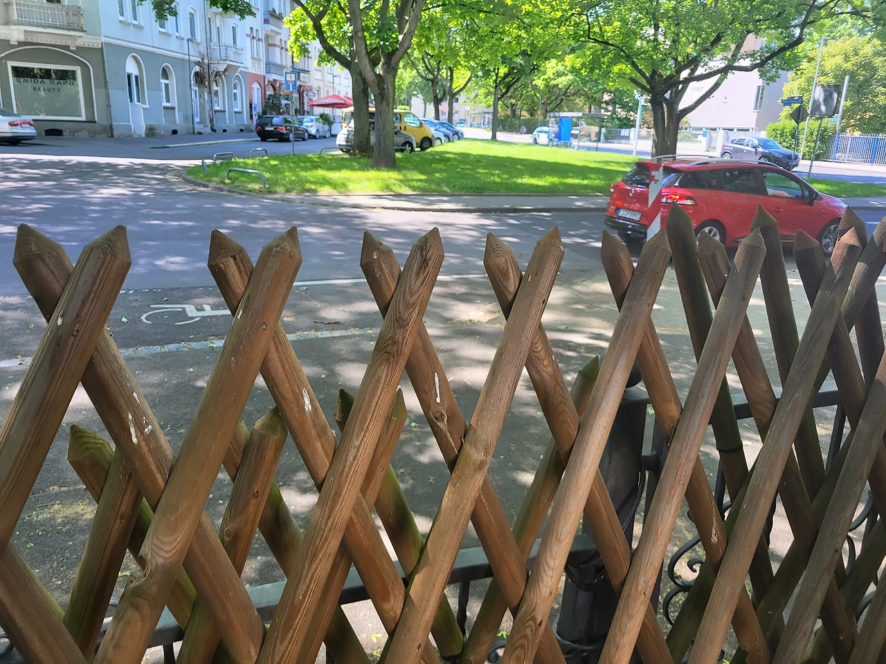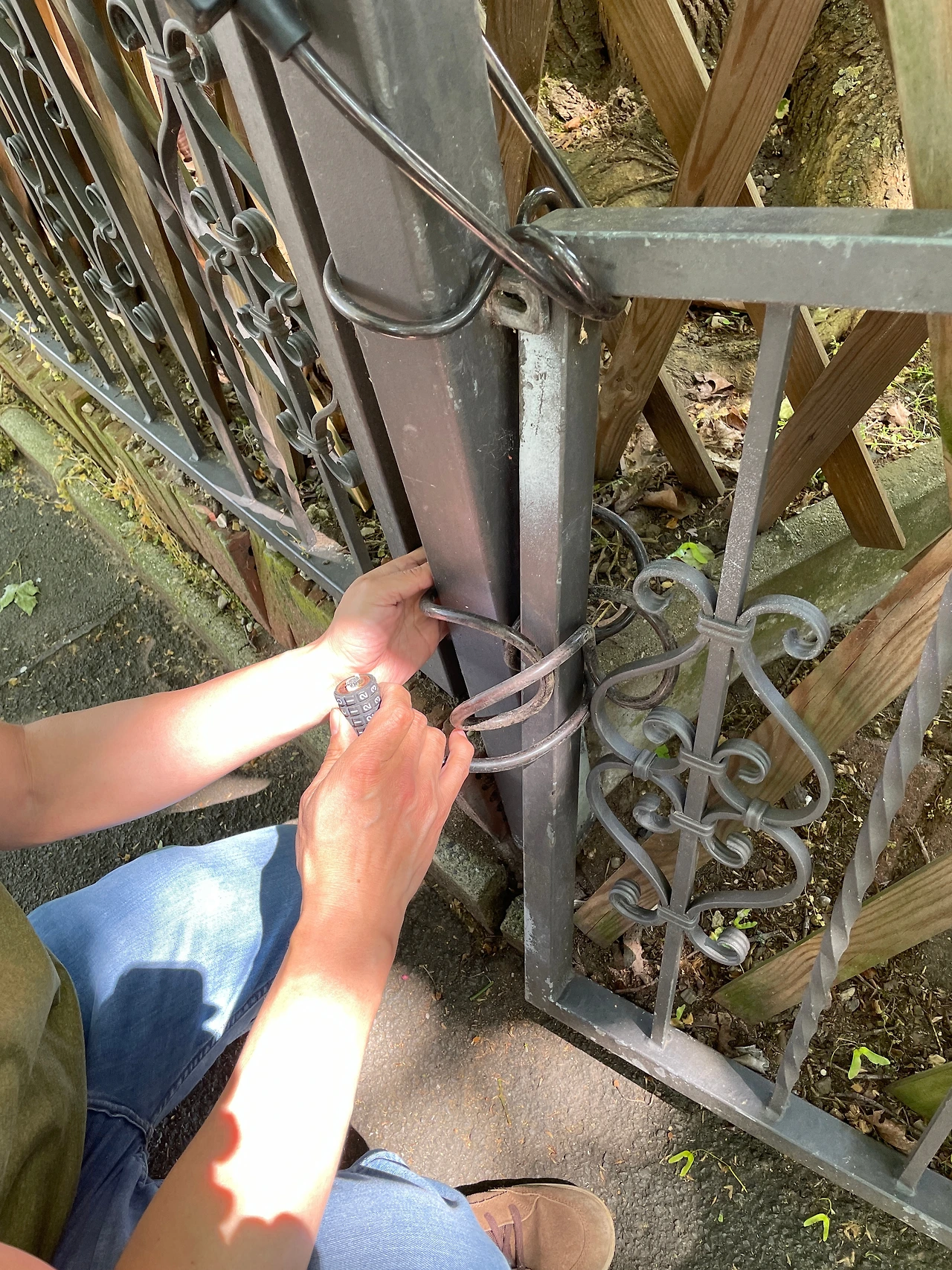 기술자를 불렀는데 아직 오지 않고 있어 임시방편으로 울타리와 울타리 사이를 4개의 자전거 열쇠로 고정을 해 두었다.