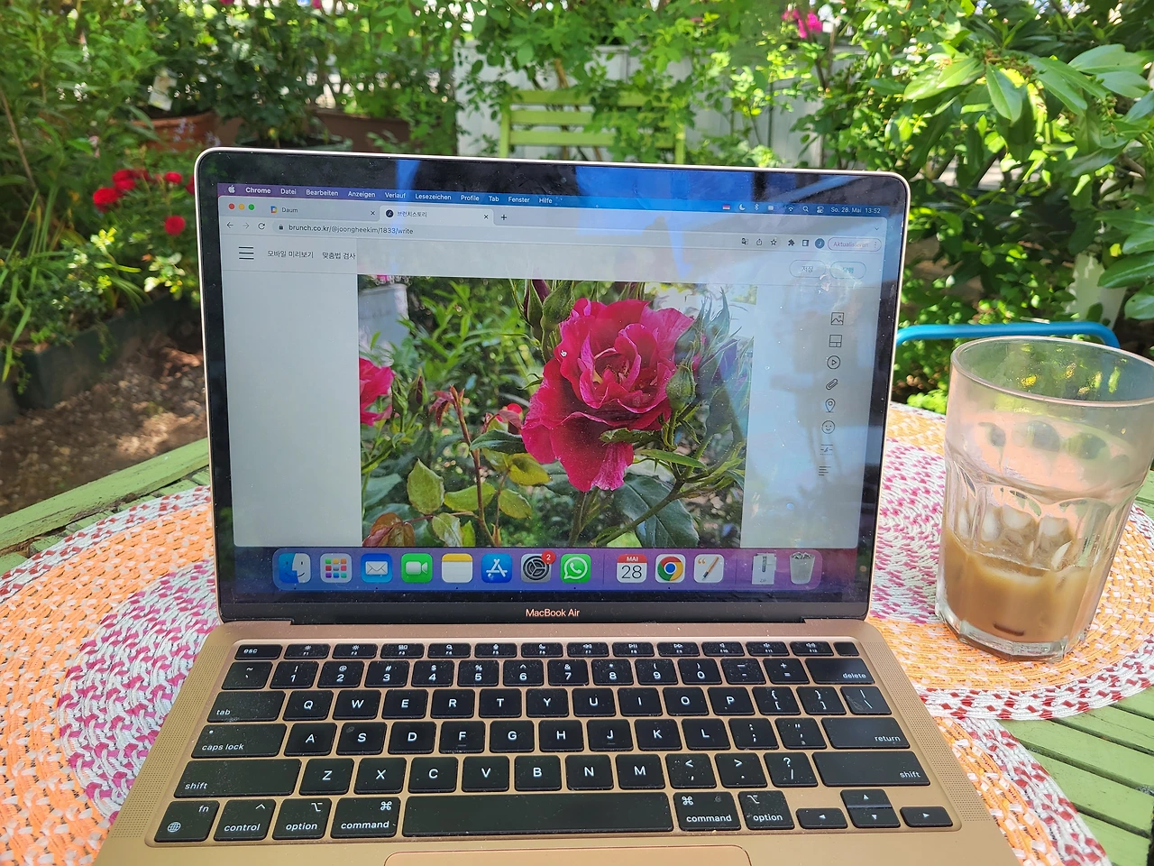 가져온 꽃들을 다 심고 냉커피 타다 얼음 동동 띄어 남편과 정원에 앉아 있었다.