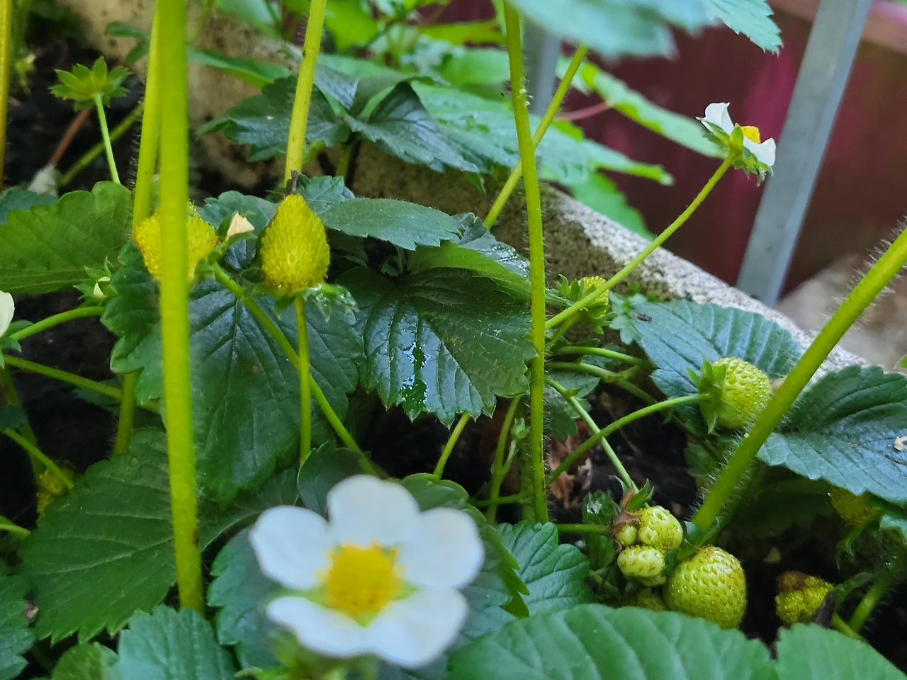 또 하얀 꽃이 피고 초록의 딸기알이 맺힌 딸기는 빨갛게 익어 가기만 남았다.