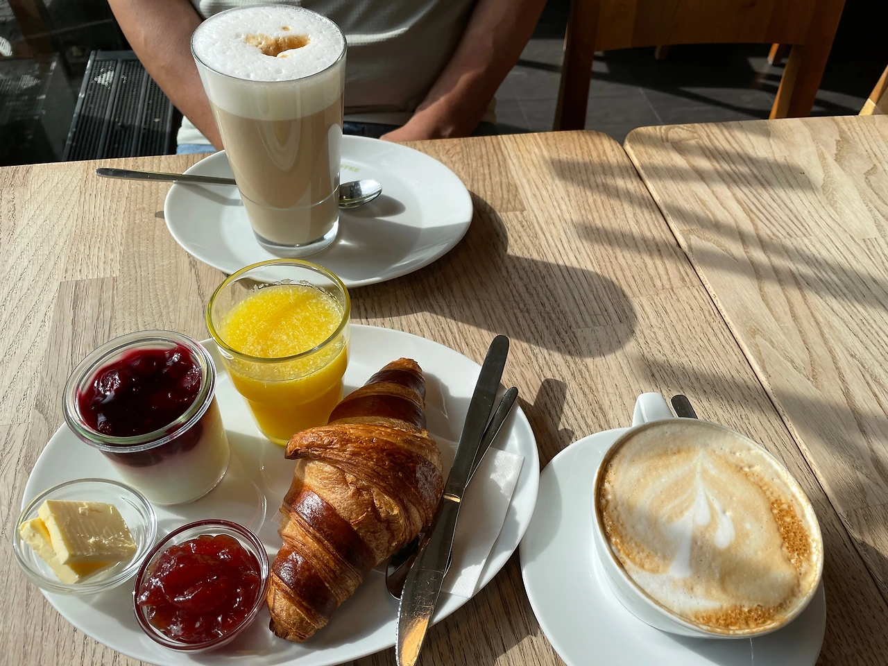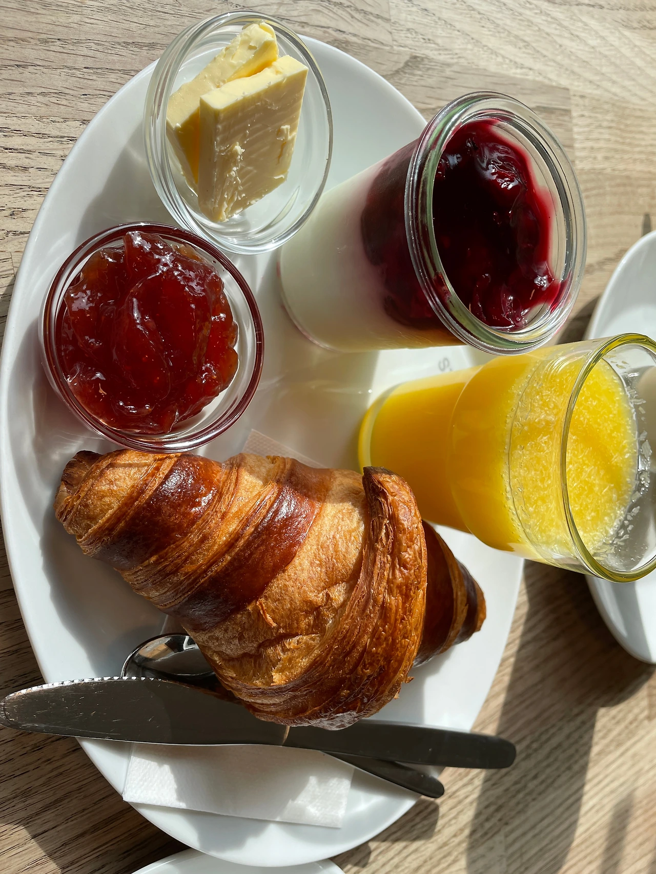 한국에서 먹던 부드럽고 달달하던 크루아상에 비해 조금은 딱딱하고 맹맹한 크루아상에 버터와 딸기잼을 얹어 먹으며...