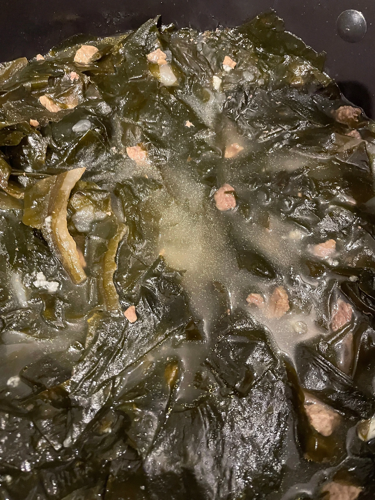 잘 불려진 미역을 깨끗이 헹궈내서 미리 꺼내둔 커다란 국솥에 넣고 그 위에 마늘과 잘게 자른 소고기를