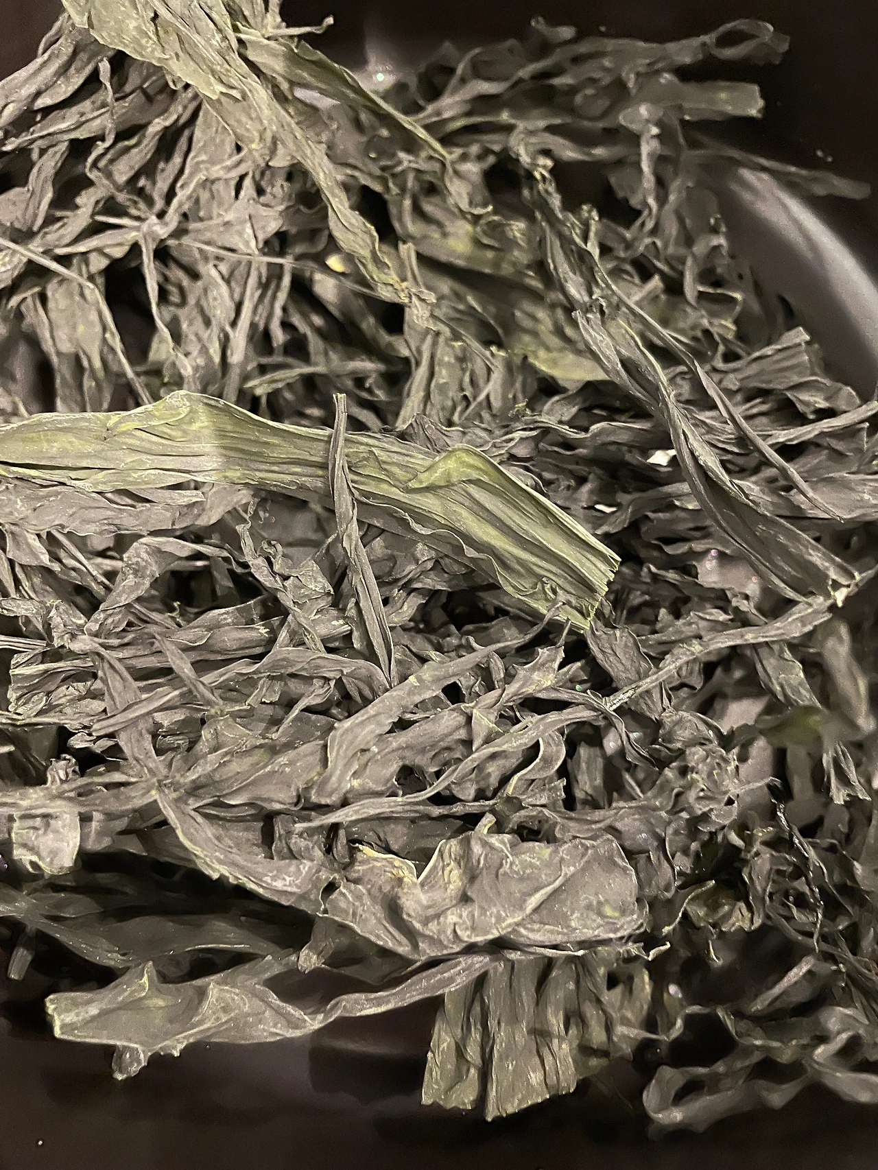 남편이 좋아하는 미역국을 끓이기로 한다. 이번에 한국에서 가져온 마른미역을 잘라 맑은 물에 불린다.