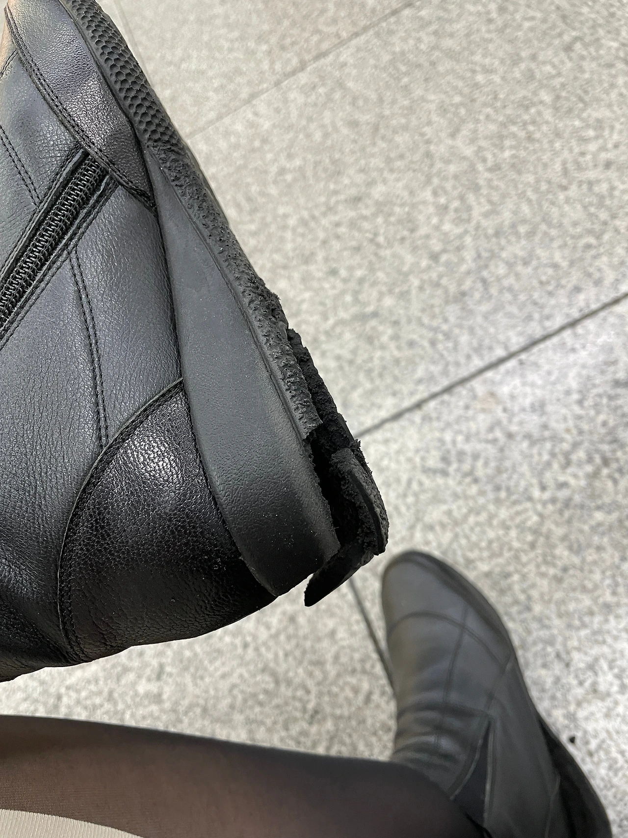 세상에나 부츠의 뒤축이 떨어져 나가고 있는 게 아닌가?