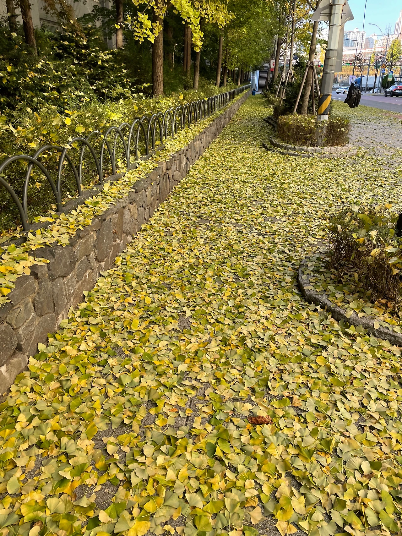 아직 노랗게 물들지 못한 초록의 은행잎 들과 노란 은행잎이 뒤섞여 연두빛깔의 길을 내어 주던 주말이었다.