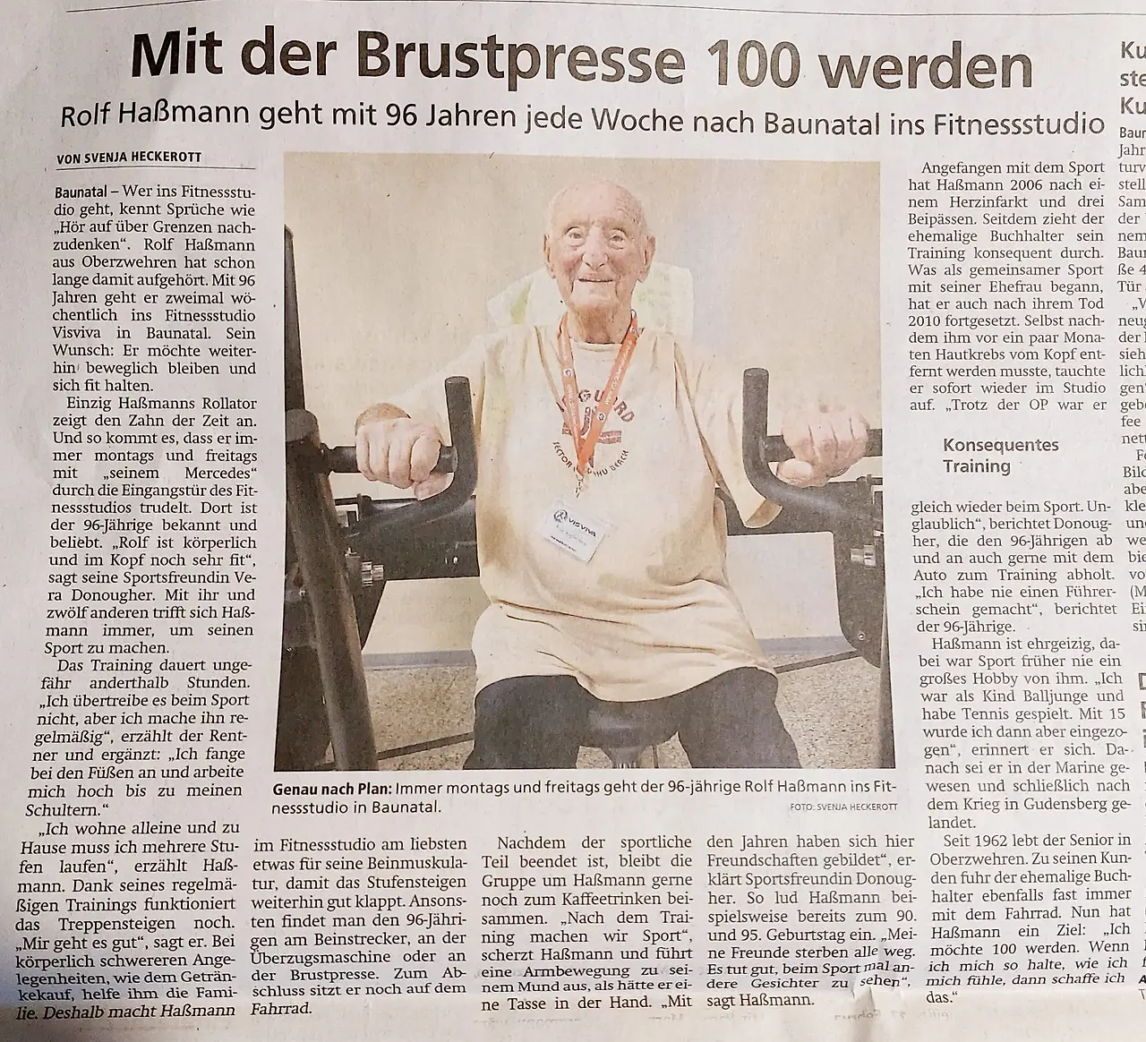 70도 아니고 80도 아닌 자그마치 96세에 헬스를 한다는 것은 독일에서도 드문 일이라 당당히 지역신문 에도 나셨다.