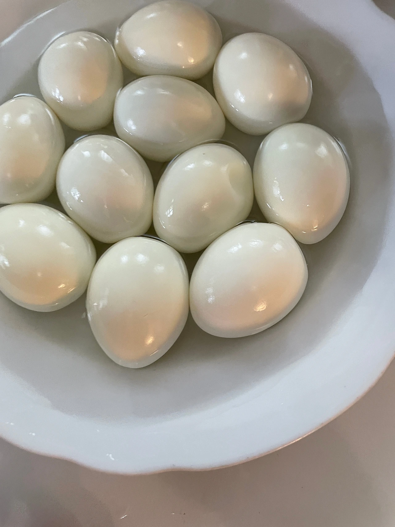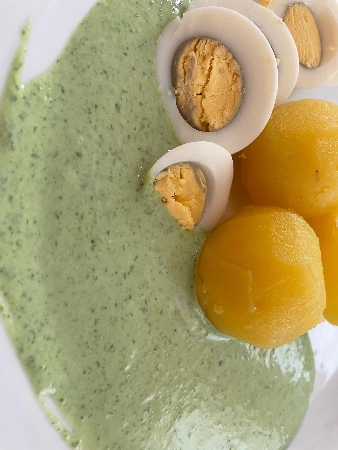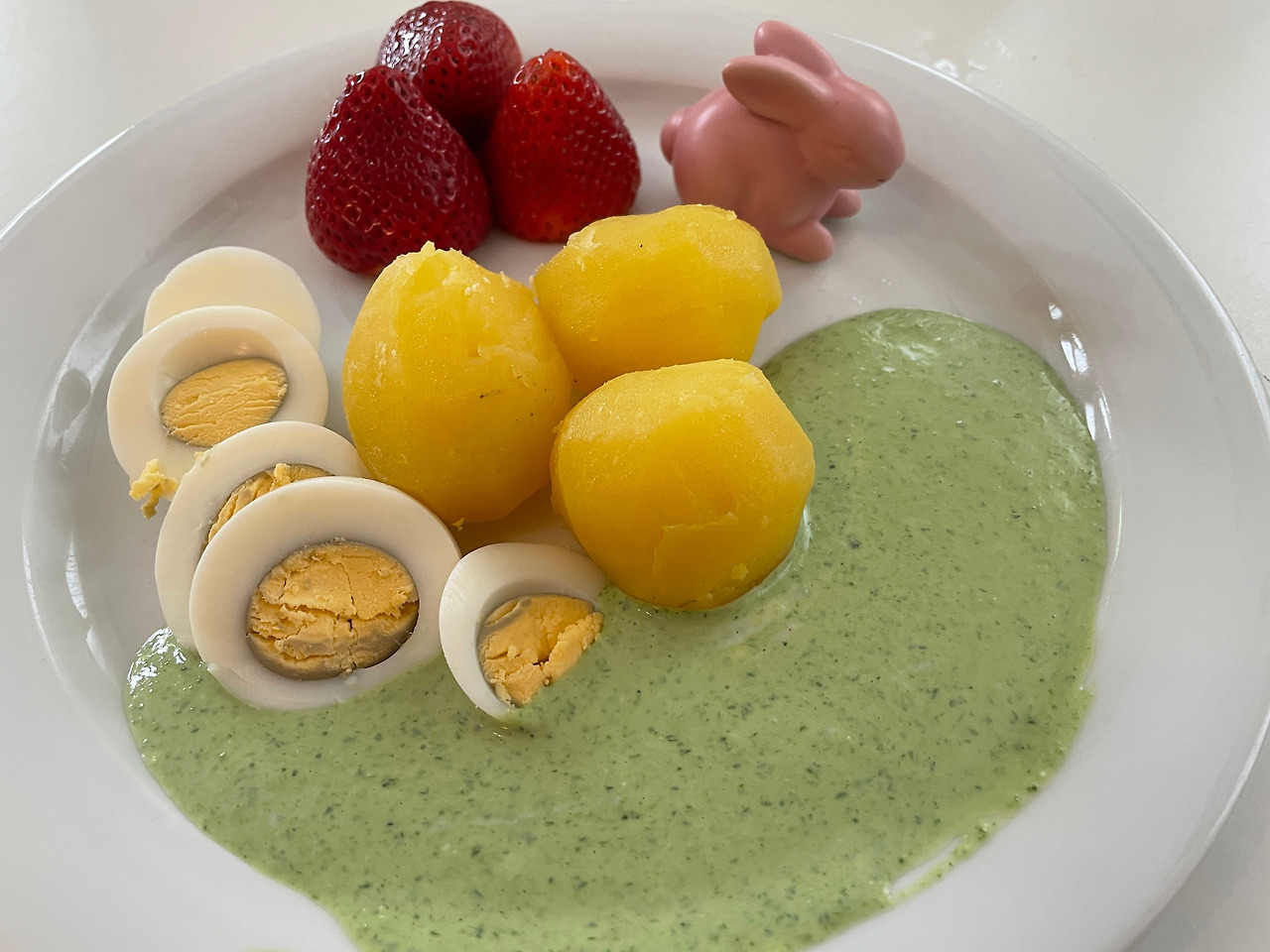 이렇게 그린소스가 준비되면 큰 접시에 미리 준비해 둔 삶은 계란과 감자를 올리고 그 옆에 그린소스를 담아 두면 독일식 봄 식탁 완성~!