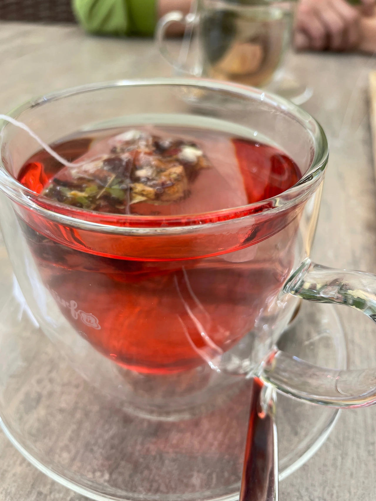 따뜻한 물만 담겨 왔던 유리잔 안에 차티베트를 담그니 어여쁜 주홍색으로 과일차가 우러났다.