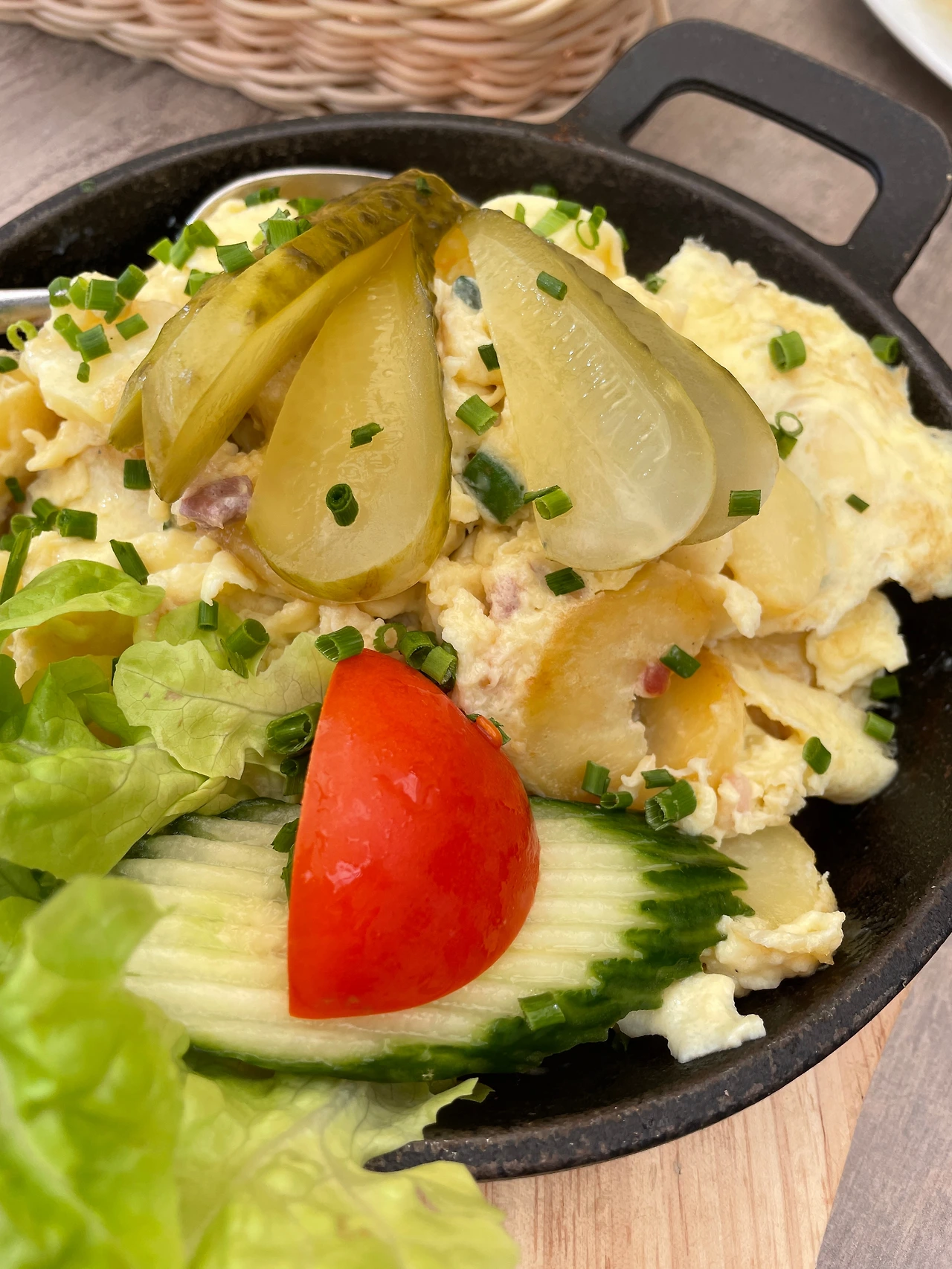 그리고 계란과 감자와 잘게 자른 베이컨 스크램블 위에 오이피클이 올려져 있는 나의 시골 브런치가