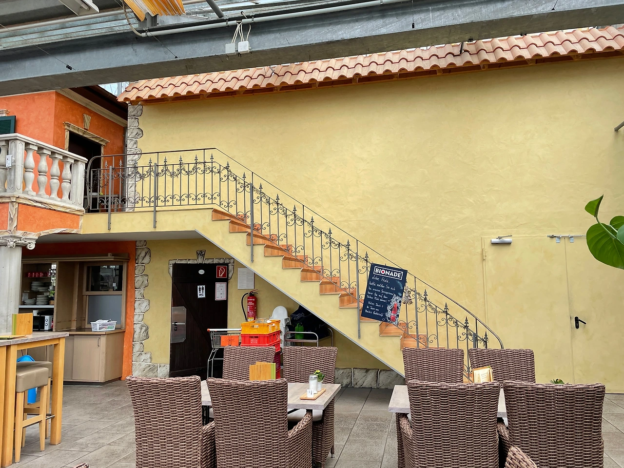 우리 테이블 맡은 편에는 2층으로 향하는 긴 계단이 있다.