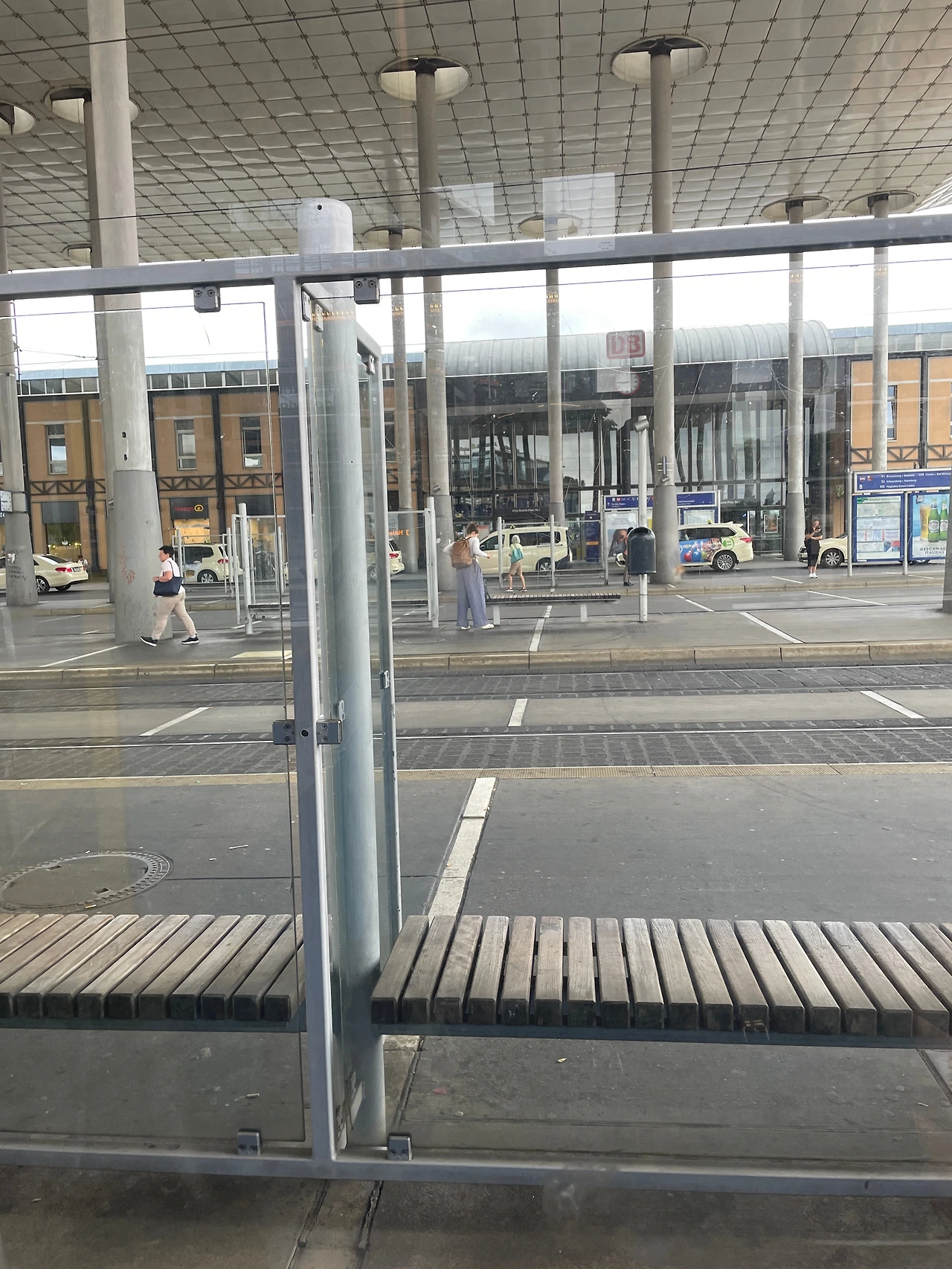 트램 정류장에는 유리로 된 처마가 있고 촘촘한 목재로 되어 있는 긴 의자들이