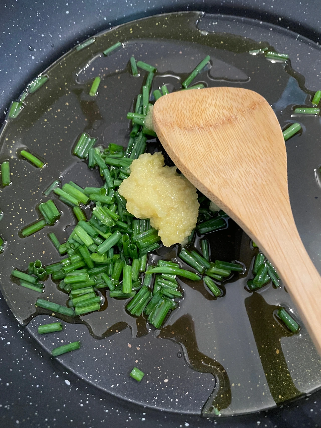 우선 조금 깊은 프라이팬 하나에 파를 얇게 썰어 놓고 올리브유 두르고 마늘 간 것 넣고볶습니다
