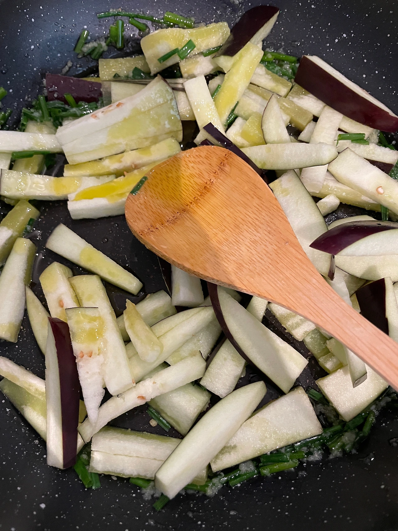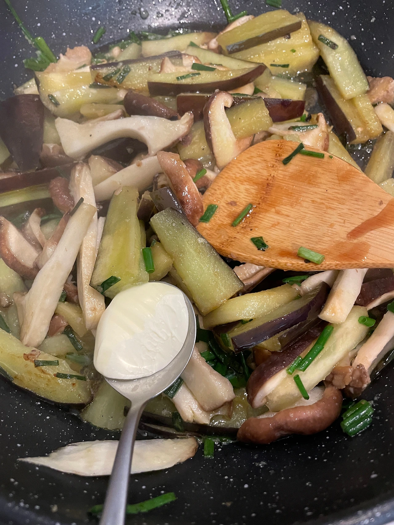 그 기름에 길쭉길쭉 썰어둔 가지를 볶다가 가지가 부들부들 투명해지면서 익어 갈 때 길게 잘라둔 두 가지 버섯을 넣고 함께 볶으며 분량의 간장과 소금, 후추, *굴소스로 간을 합니다.