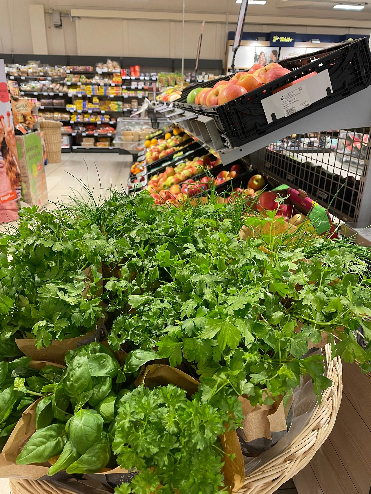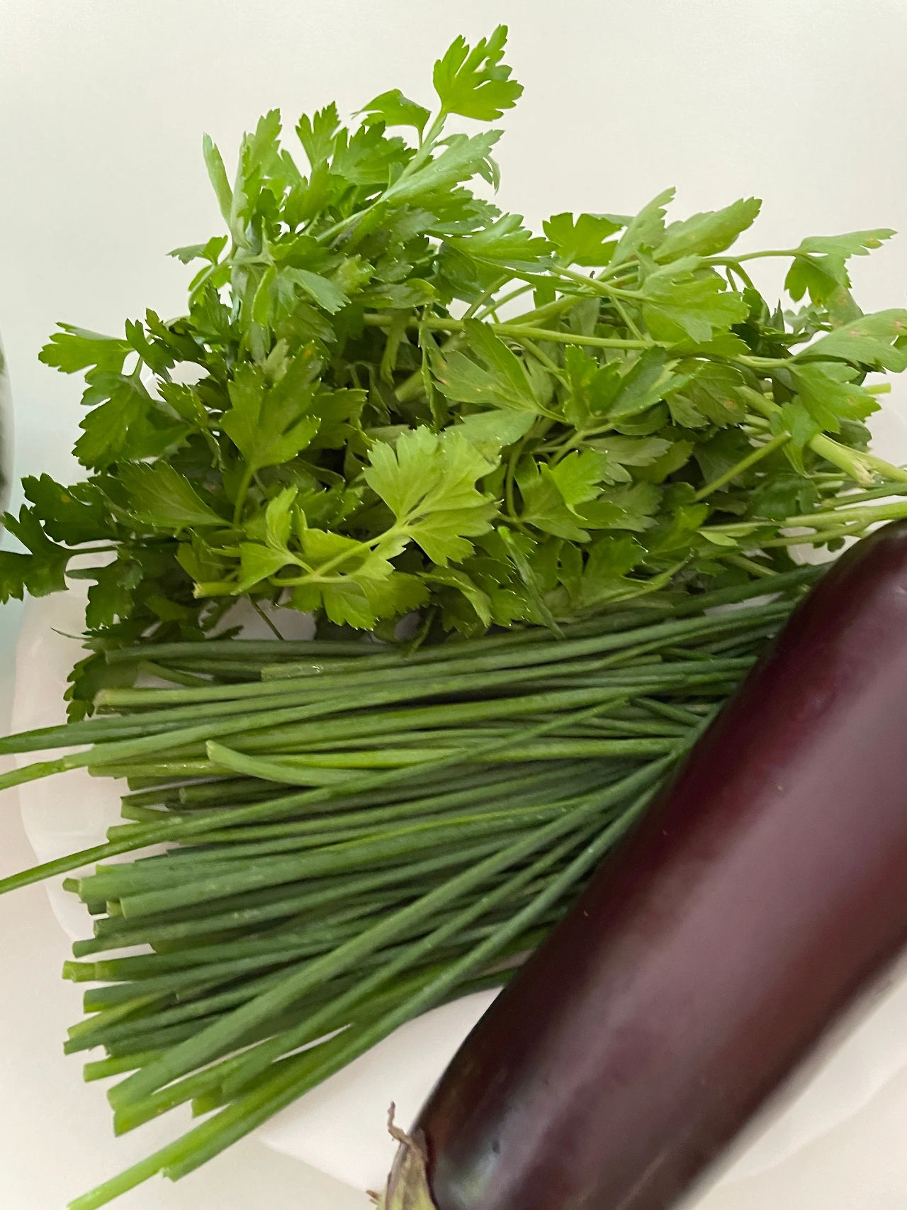 얇은 면을 좋아하는 남편을 위해 얇은 스파게티 면을 담고 (파슬리와 얇은 파의 일종인 슈니트라우흐) 두 가지 허브를 담았다.