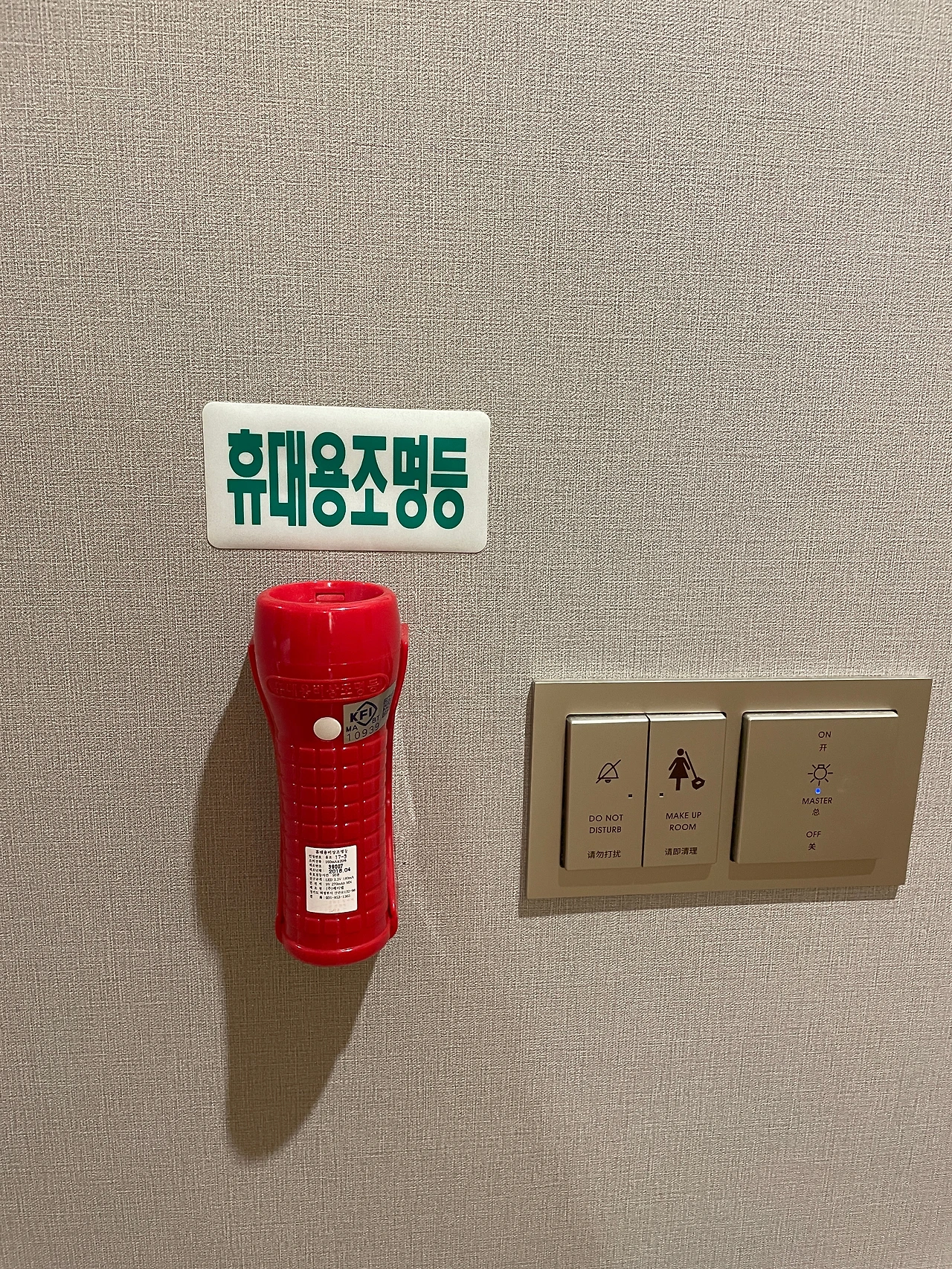 어두컴컴한 욕실에서 밝은 복도로 다시 나오니 맞은편 에 빨간색 커다란 손전등이 휴대용 조명등이라고 써져 있는 초록색 글씨와 함께 벽에 붙어 있었다